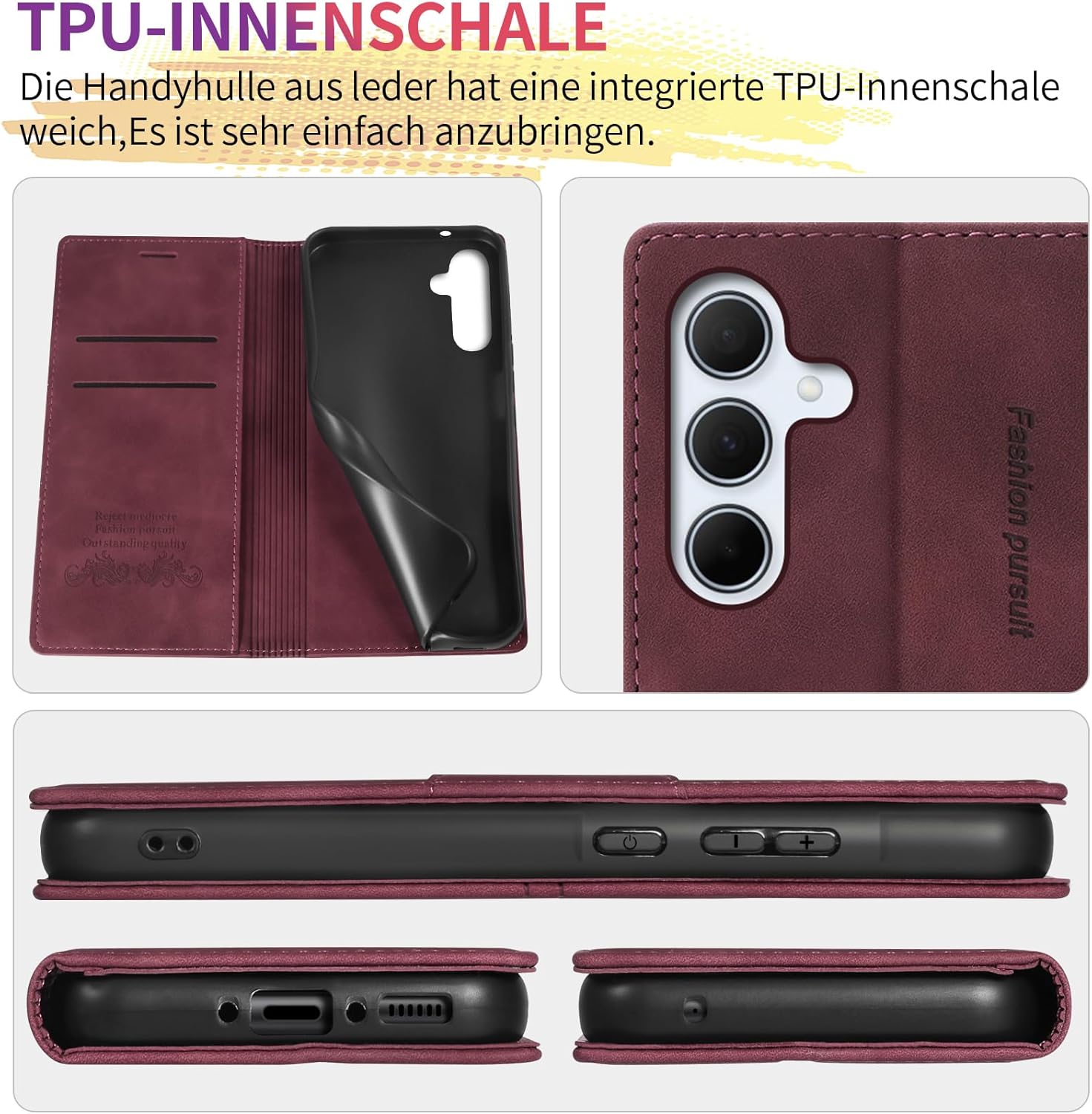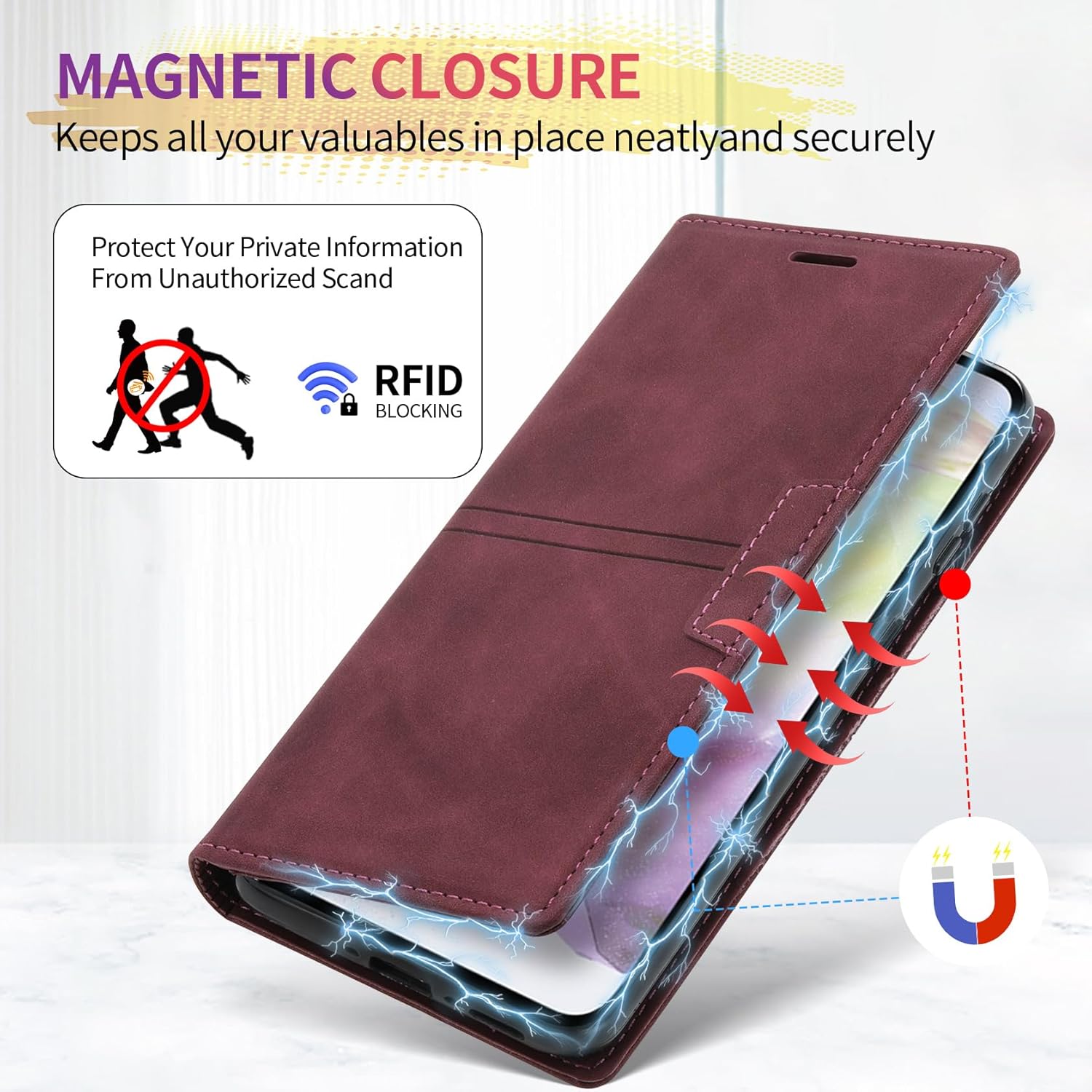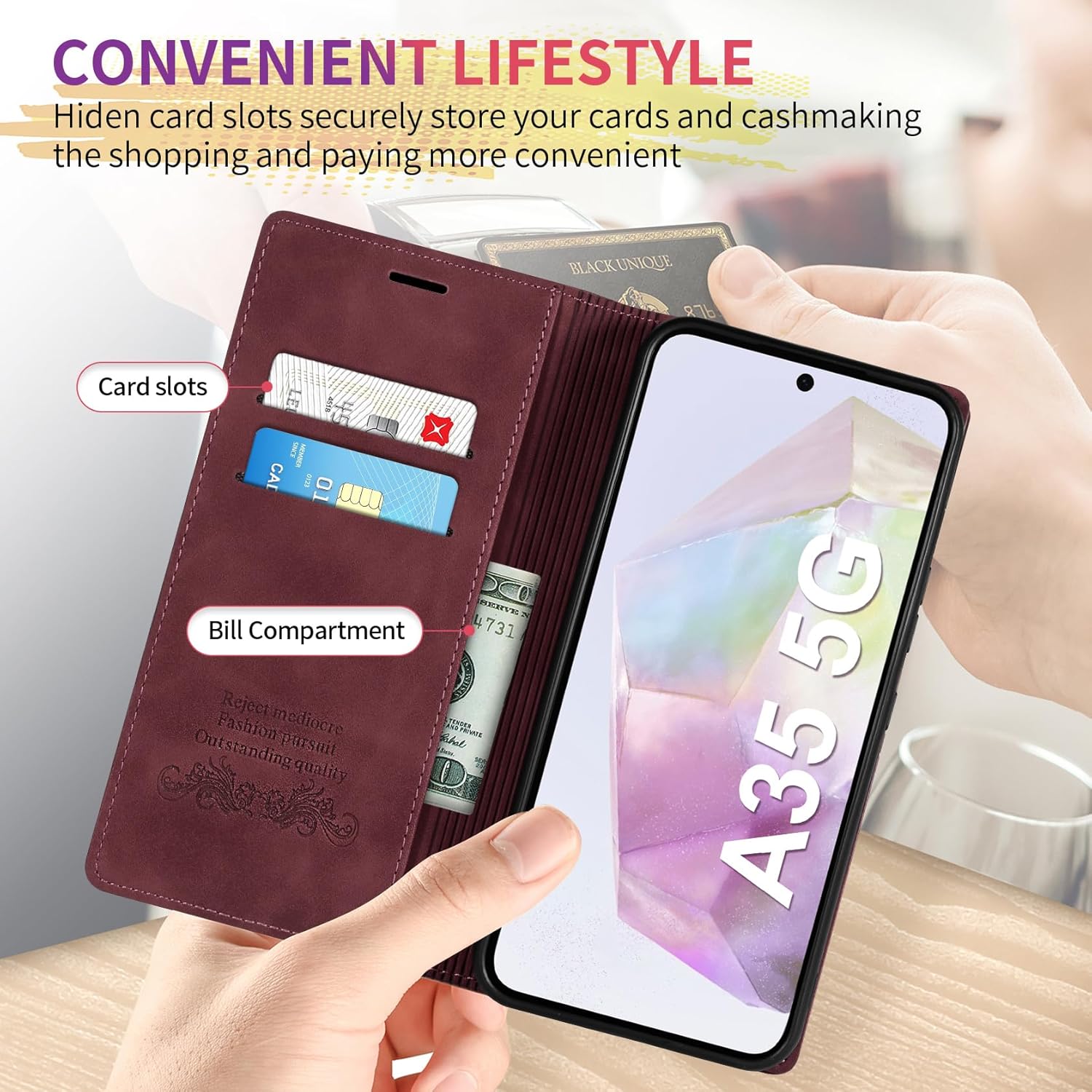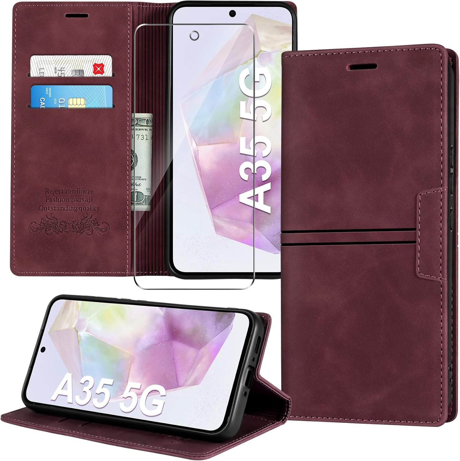 Калъф за мобилен телефон за Samsung Galaxy A35 5G, кожен калъф с протектор за екран, защитен калъф из изкуствена кожа за Samsung A35, сгъваем калъф, стойка, слот за карти, калъф-портфейл, бордо червен