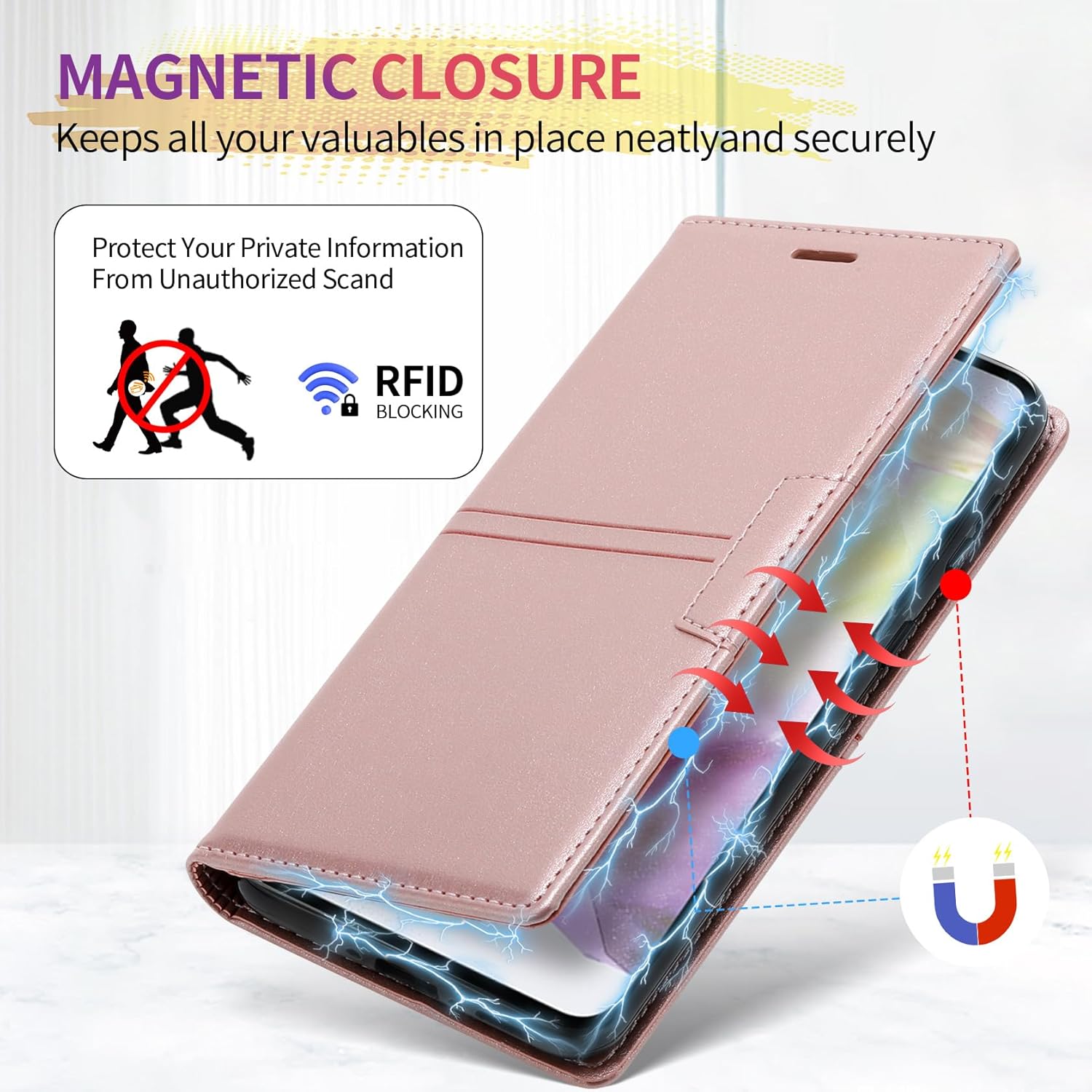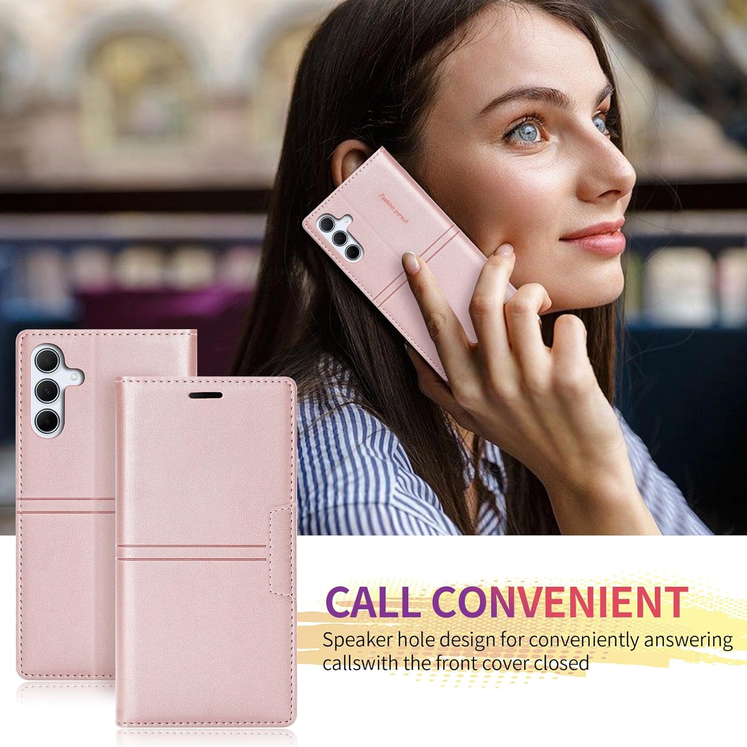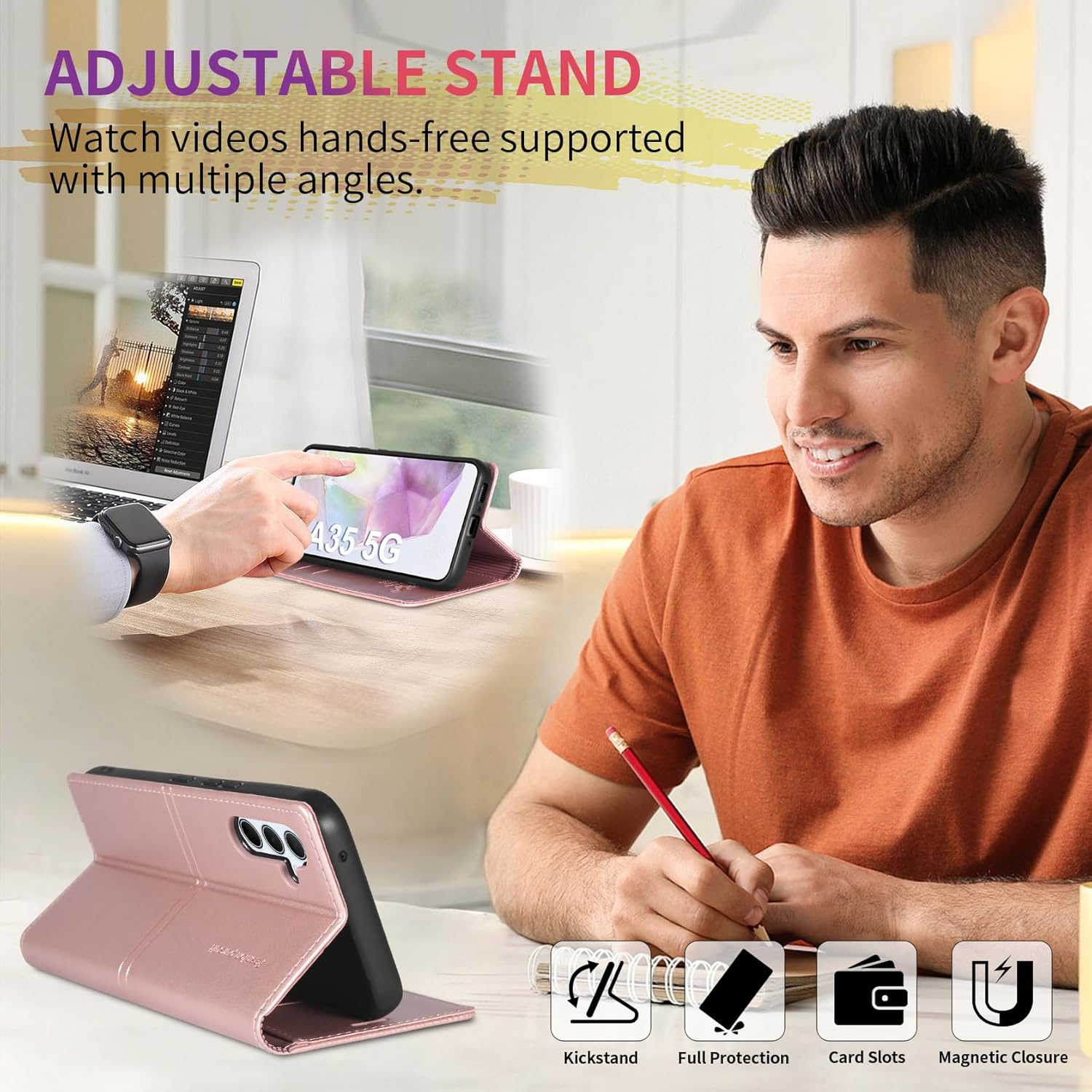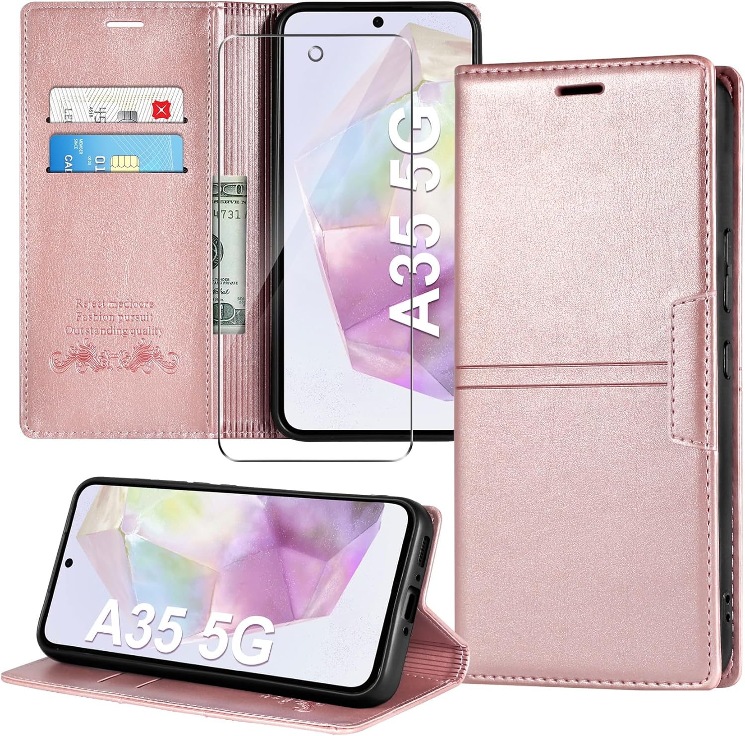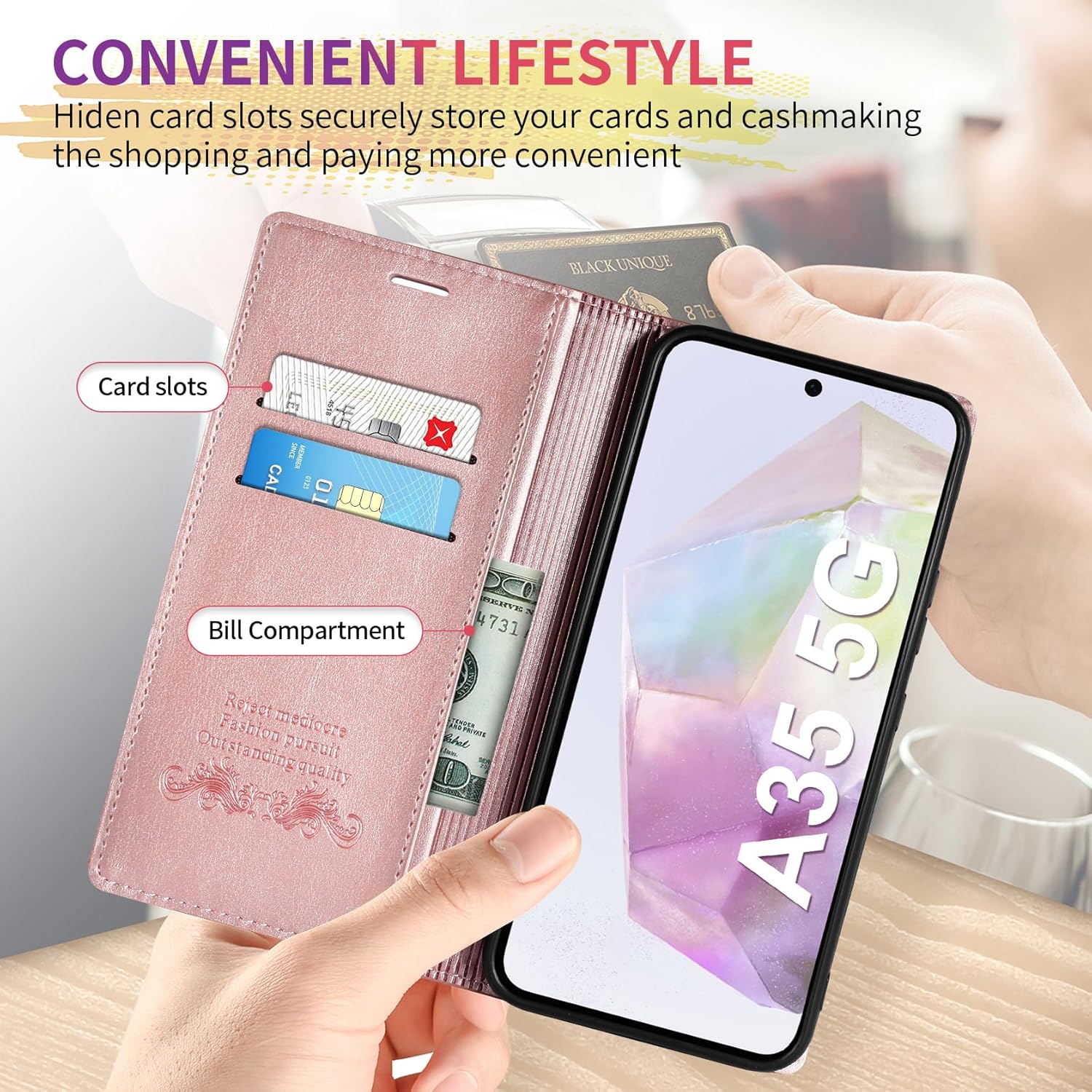 Калъф за мобилен телефон за Samsung Galaxy A35 5G, кожен калъф с протектор за екран, защитен калъф из изкуствена кожа за Samsung A35, сгъваем калъф, стойка, слот за карти, калъф-портфейл, розово злато