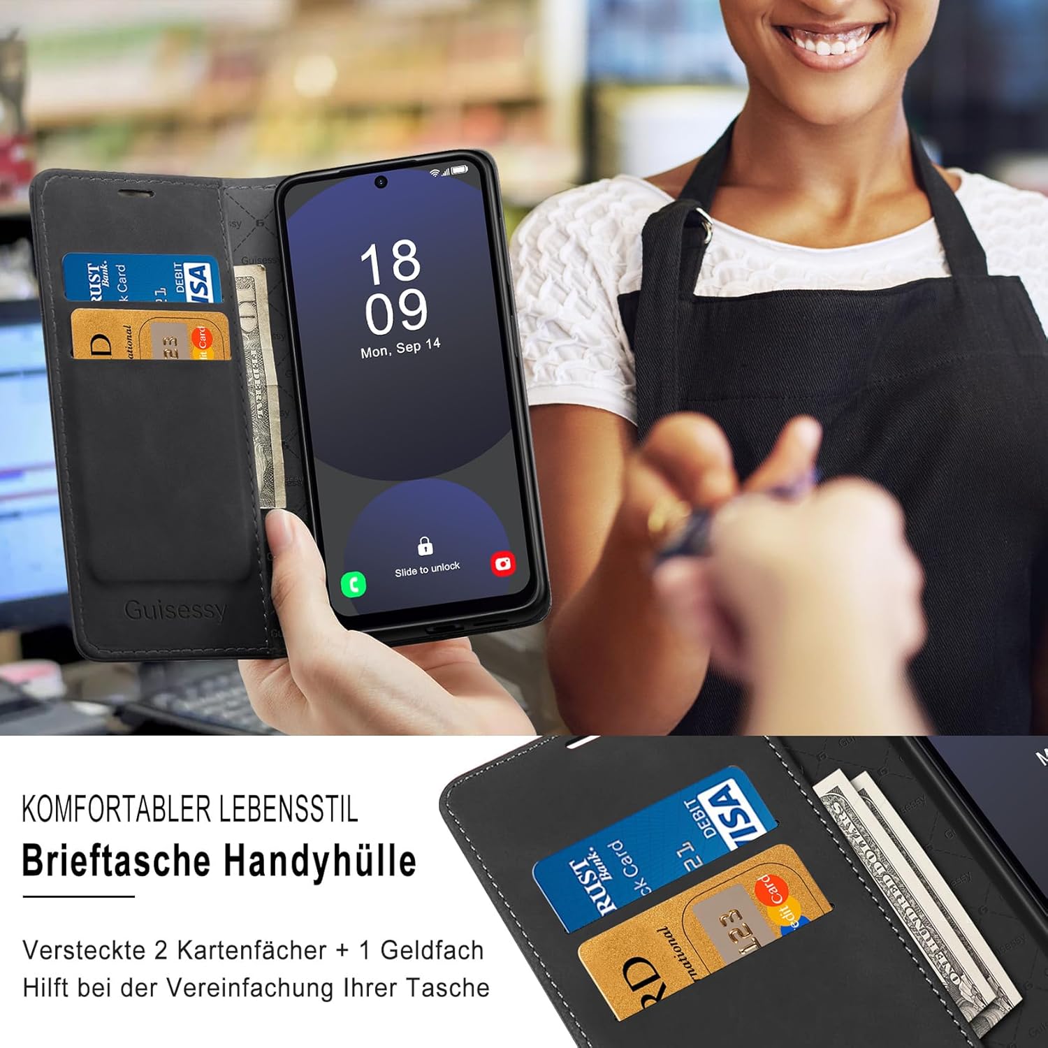 • Стил портфейл: съвместим с Samsung Galaxy S25 FE, сгъваем кожен калъф, перфектна комбинация от калъф за мобилен телефон и портфейл. Два слота за карти за кредитни карти, лична карта, визитки и страничен джоб за пари, касови бележки и сметки. Може да служи като калъф и сигурен преносим портфейл.