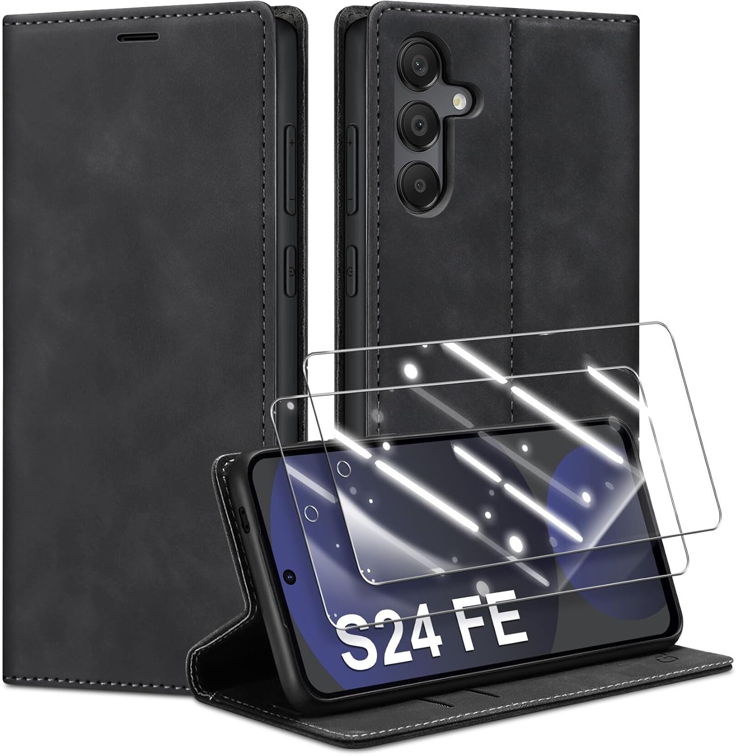 Калъф за мобилен телефон за Samsung Galaxy S24 FE 5G, кожен калъф и 2 протектора за екран, първокласен сгъваем портфейл с магнитен слот за карти, функция стойка, защитен калъф за Samsung S24 FE.