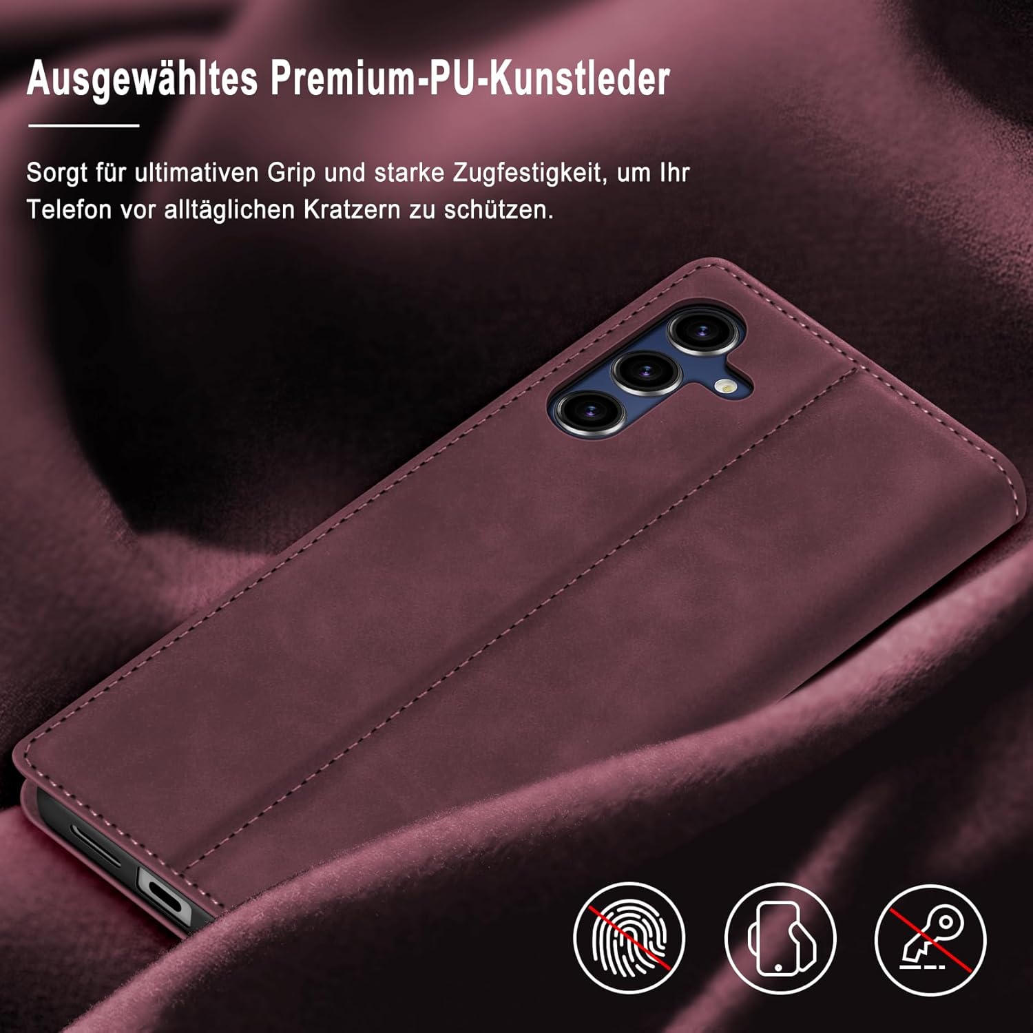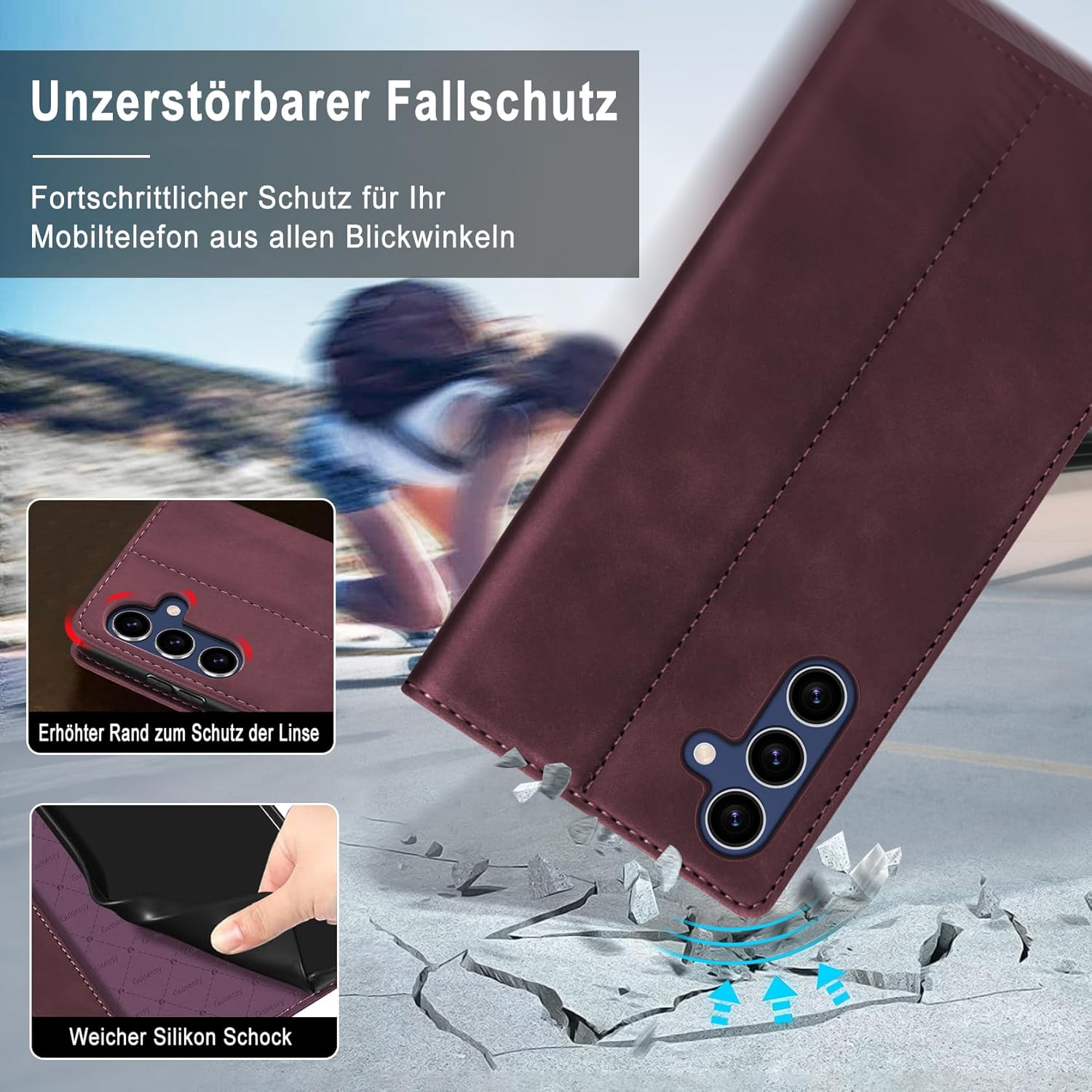 • Премиум PU кожа: Този калъф-портфейл за Samsung Galaxy S25 FE 5G е изработен от висококачествена изкуствена кожа PU и мек и гладък силиконов TPU. Елегантен външен вид, качествената PU има деликатен захват и силна якост на опън, но също така е удароустойчив и осигурява максимална защита от замърсявания, удари и драскотини, осигурявайки отлична 360-градусова всестранна защита.