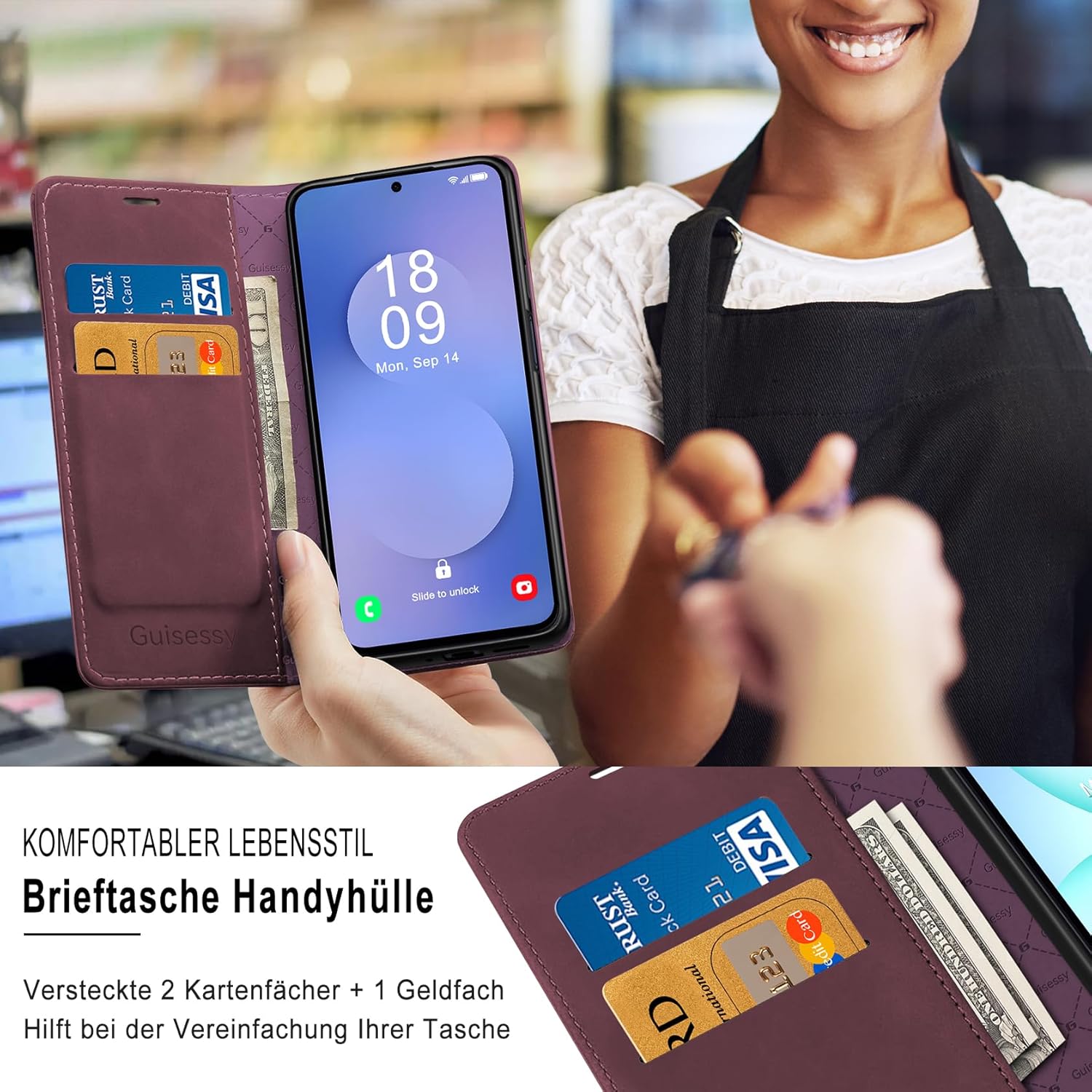 • Вградено магнитно закопчаване: Калъфът за мобилен телефон Guisessy за Samsung Galaxy S25 FE има вградено магнитно закопчаване, може лесно да се отваря и затваря, прави използването на телефона по-лесно и удобно. Вграденото силно магнитно закопчаване подобрява магнитната връзка, предпазва телефона ви, когато не се използва, като ефективно предотвратява случайно отваряне на калъфа.