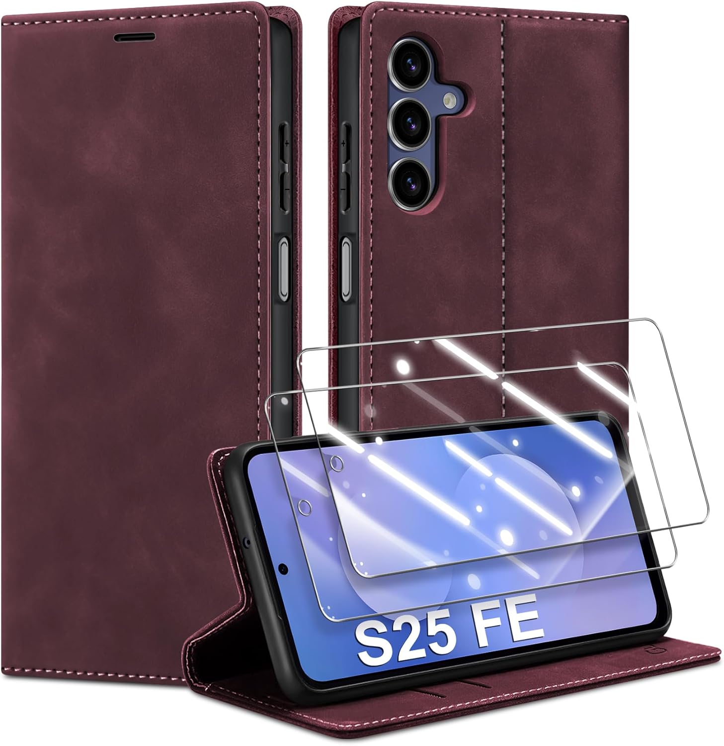 Калъф за мобилен телефон за Samsung Galaxy S25 FE 5G и 2 протектора за екран, първокласен кожен сгъваем калъф-портфейл, [магнит] [слот за карти] [функция стойка] защитен калъф за Samsung S25 FE