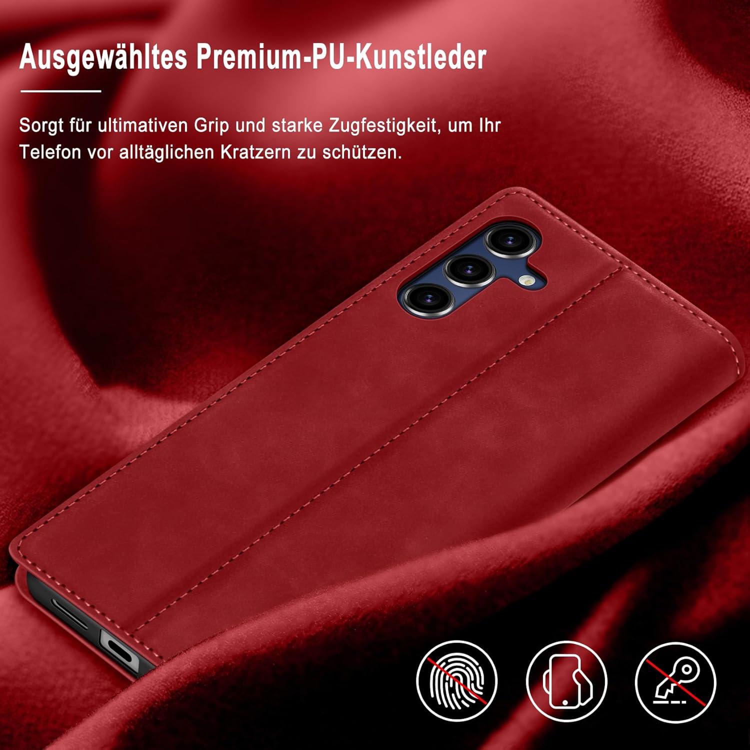 • Премиум PU кожа: Този калъф-портфейл за Samsung Galaxy S25 FE 5G е изработен от висококачествена изкуствена кожа PU и мек и гладък силиконов TPU. Елегантен външен вид, качествената PU има деликатен захват и силна якост на опън, но също така е удароустойчив и осигурява максимална защита от замърсявания, удари и драскотини, осигурявайки отлична 360-градусова всестранна защита.