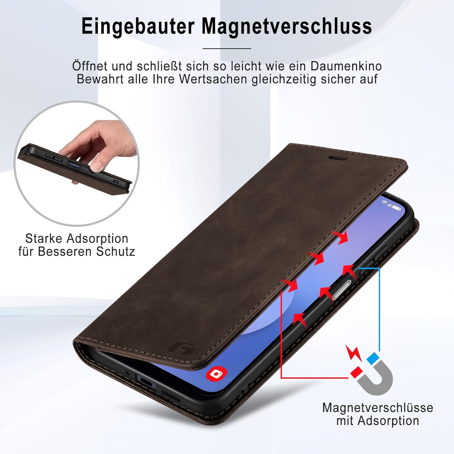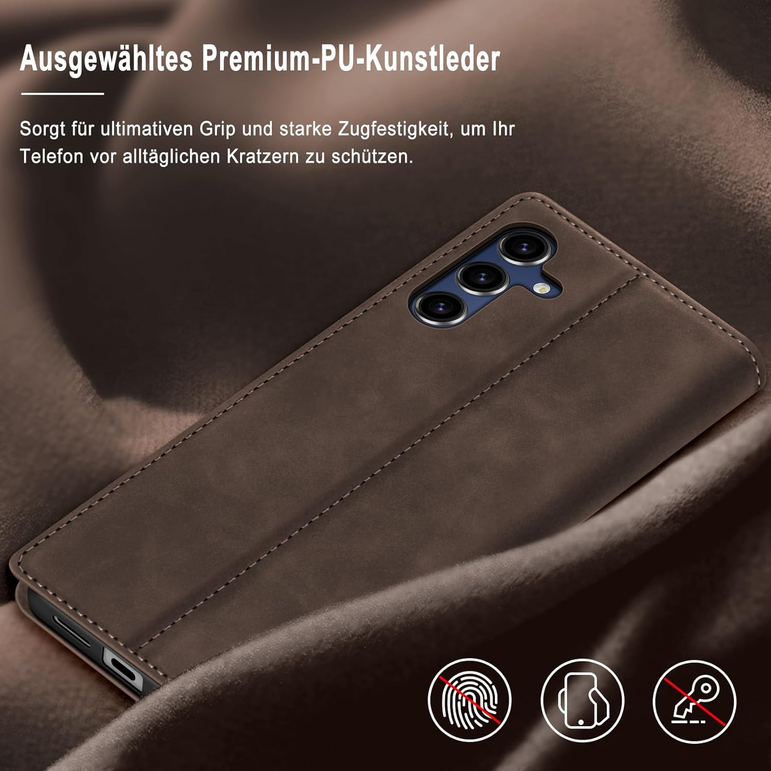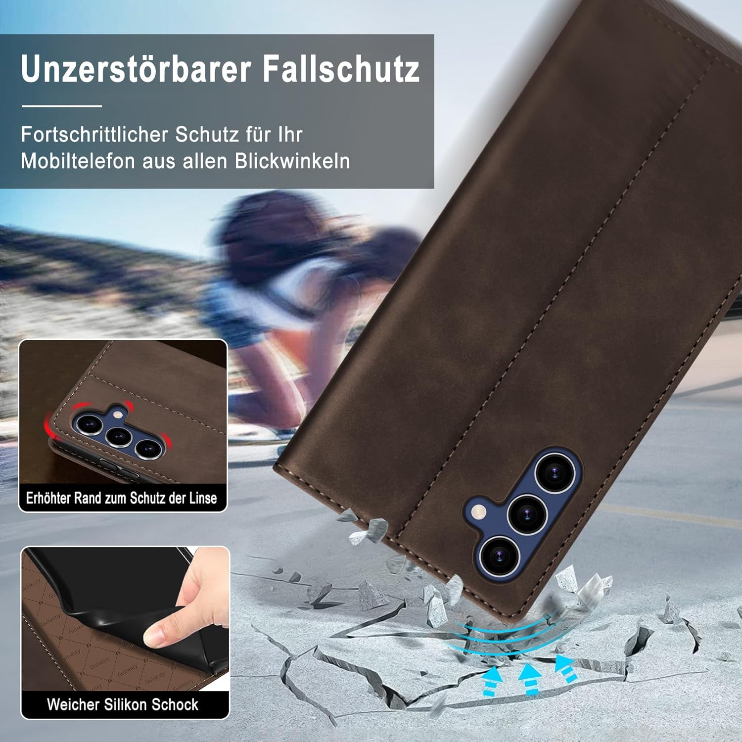 • Премиум PU кожа: Този калъф-портфейл за Samsung Galaxy S25 FE 5G е изработен от висококачествена изкуствена кожа PU и мек и гладък силиконов TPU. Елегантен външен вид, качествената PU има деликатен захват и силна якост на опън, но също така е удароустойчив и осигурява максимална защита от замърсявания, удари и драскотини, осигурявайки отлична 360-градусова всестранна защита.