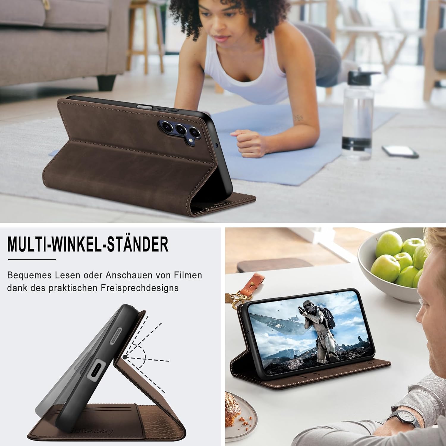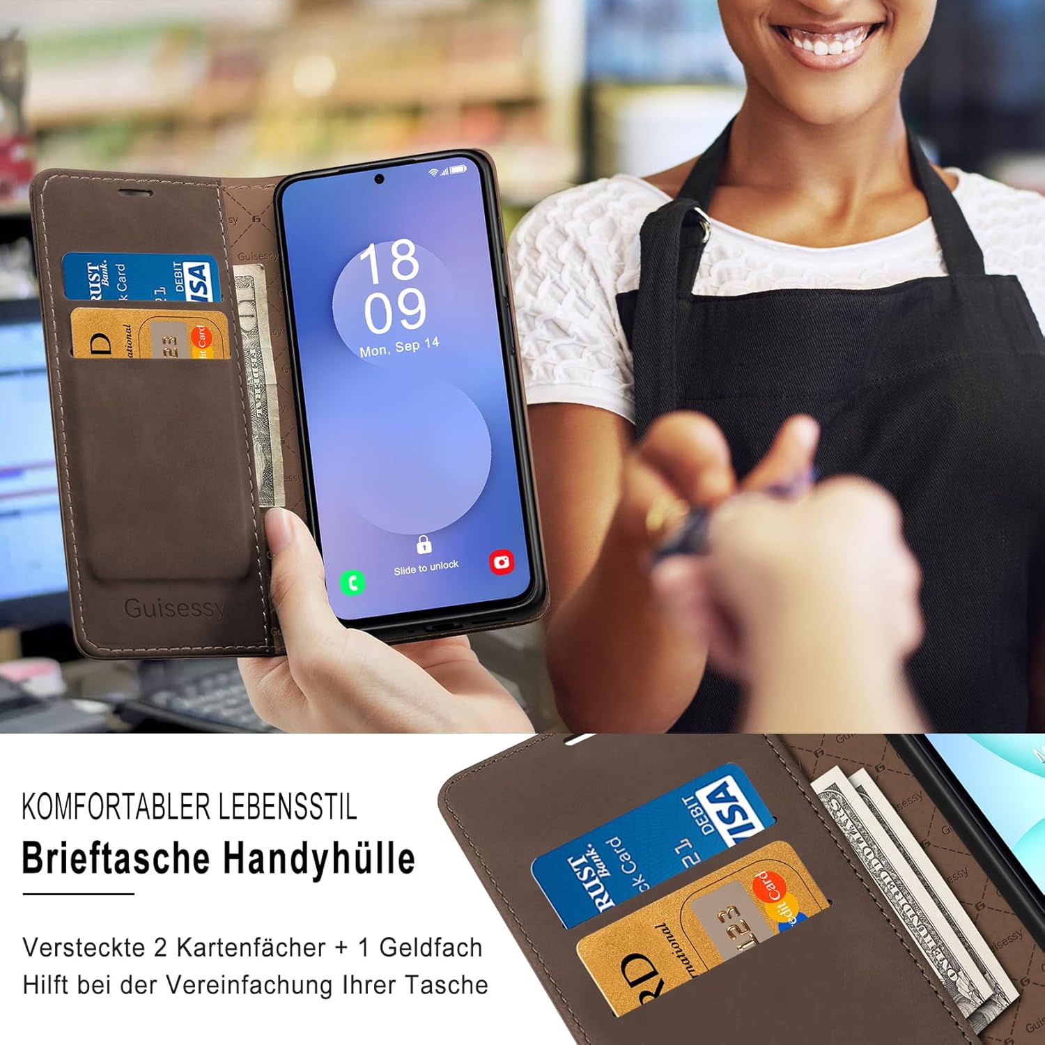 • Стил портфейл: съвместим с Samsung Galaxy S25 FE, сгъваем кожен калъф, перфектна комбинация от калъф за мобилен телефон и портфейл. Два слота за карти за кредитни карти, лична карта, визитки и страничен джоб за пари, касови бележки и сметки. Може да служи като калъф и сигурен преносим портфейл.