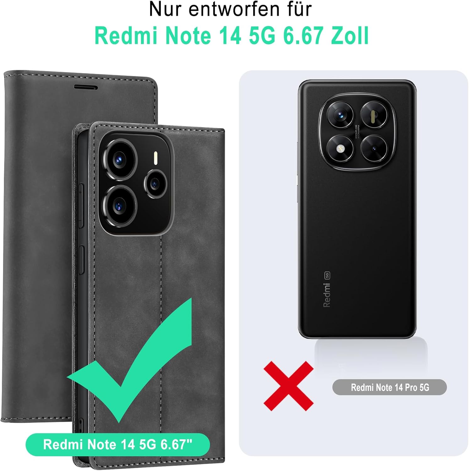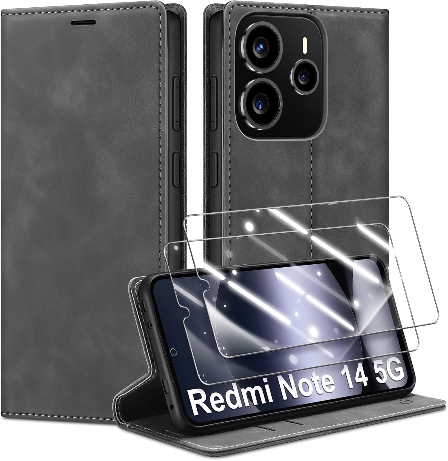 Калъф за мобилен телефон за Xiaomi Redmi Note 14 5G, кожен калъф и 2 протектора за екран, първокласен сгъваем калъф-портфейл с магнитен слот за карти, функция стойка, защитен калъф за Redmi Note