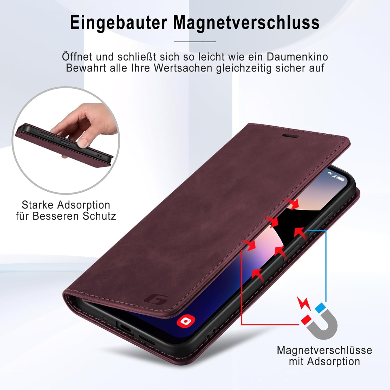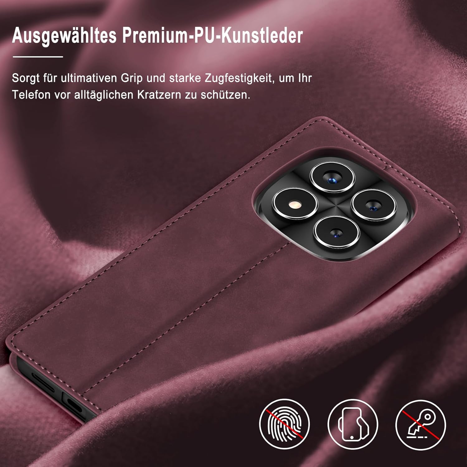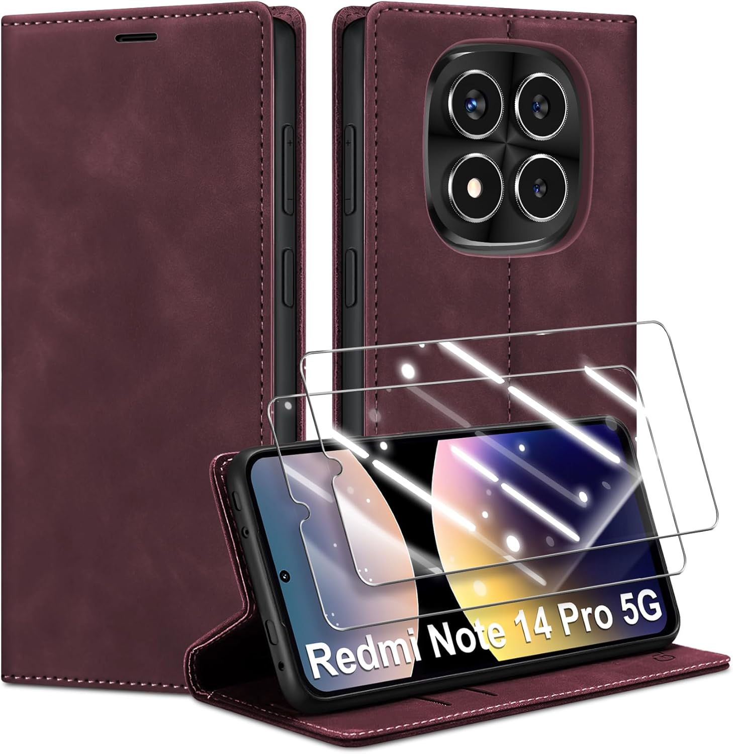 Калъф за мобилен телефон за Xiaomi Redmi Note 14 Pro 5G, кожен калъф, премиум сгъваем калъф-портфейл с магнитен слот за карти, функция стойка, защитен калъф за Redmi Note 14 Pro 5G, бордо червен