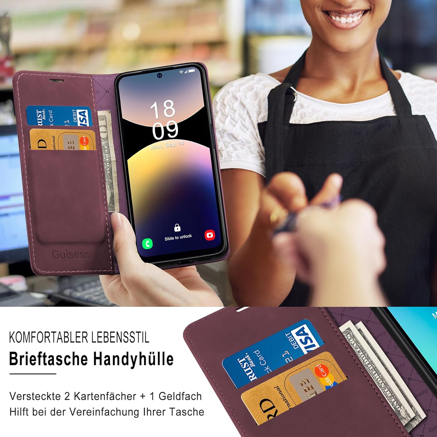 • Вградено магнитно закопчаване: Калъфът за мобилен телефон Guisessy за Samsung Galaxy S25 FE има вградено магнитно закопчаване, може лесно да се отваря и затваря, прави използването на телефона по-лесно и удобно. Вграденото силно магнитно закопчаване подобрява магнитната връзка, предпазва телефона ви, когато не се използва, като ефективно предотвратява случайно отваряне на калъфа.