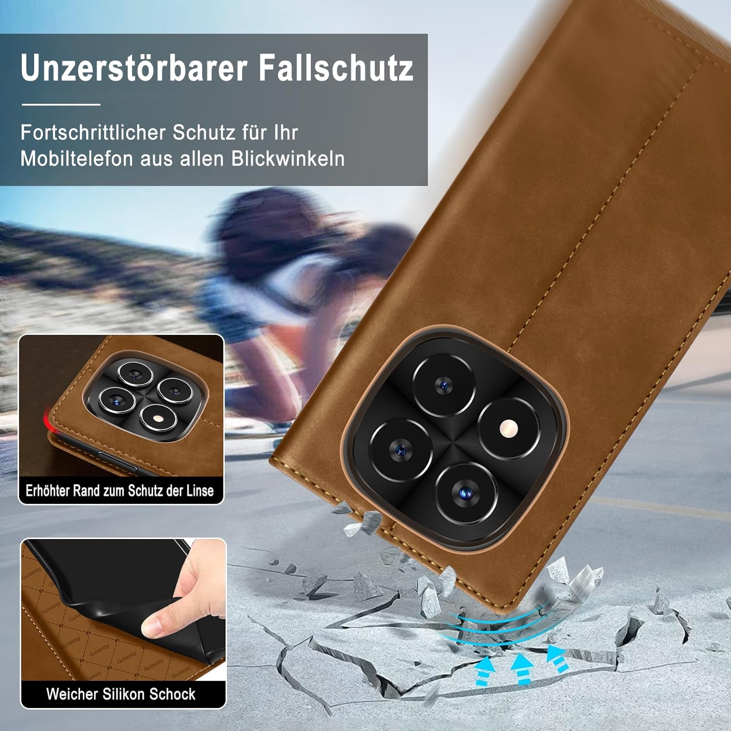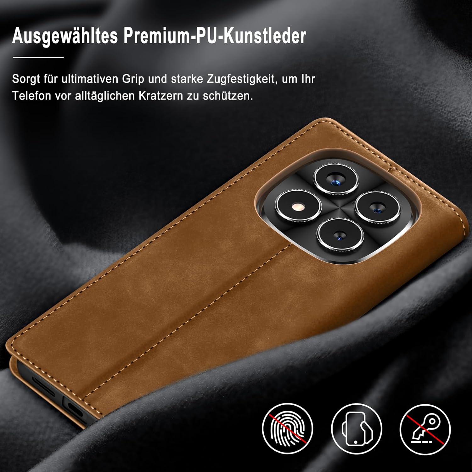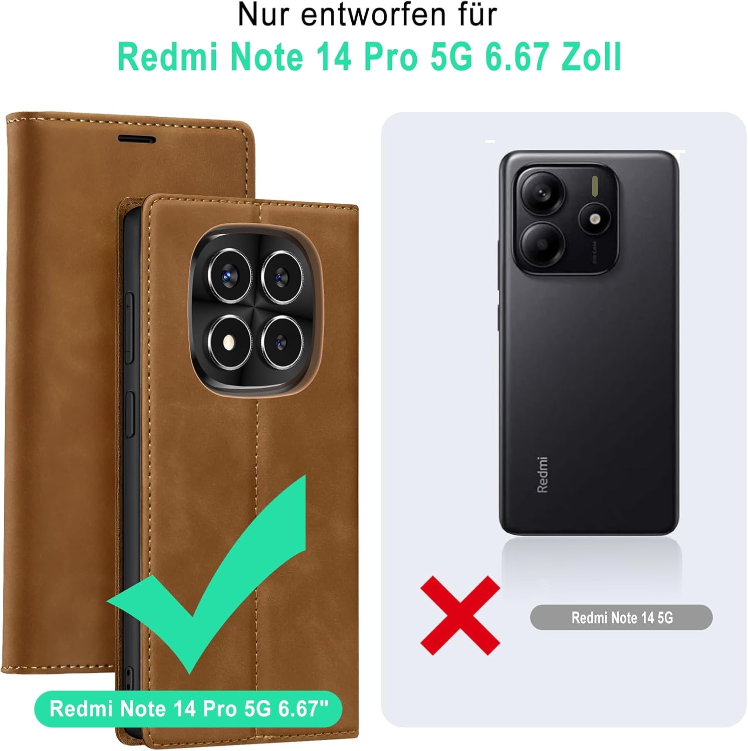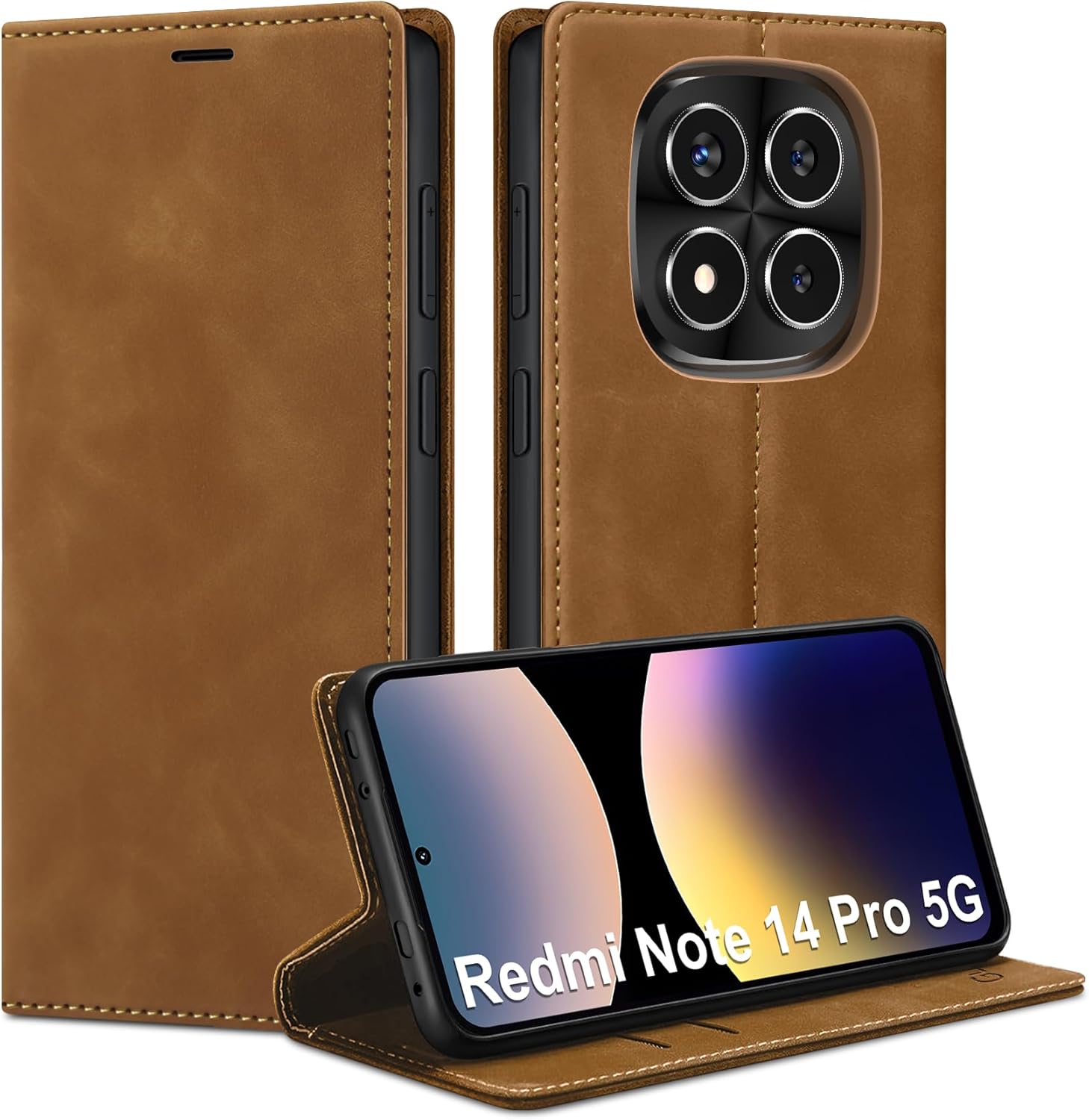Калъф за мобилен телефон за Xiaomi Redmi Note 14 Pro 5G, кожен калъф, премиум сгъваем калъф-портфейл с магнитен слот за карти, функция стойка, защитен калъф за Redmi Note 14 Pro 5G, кафяв