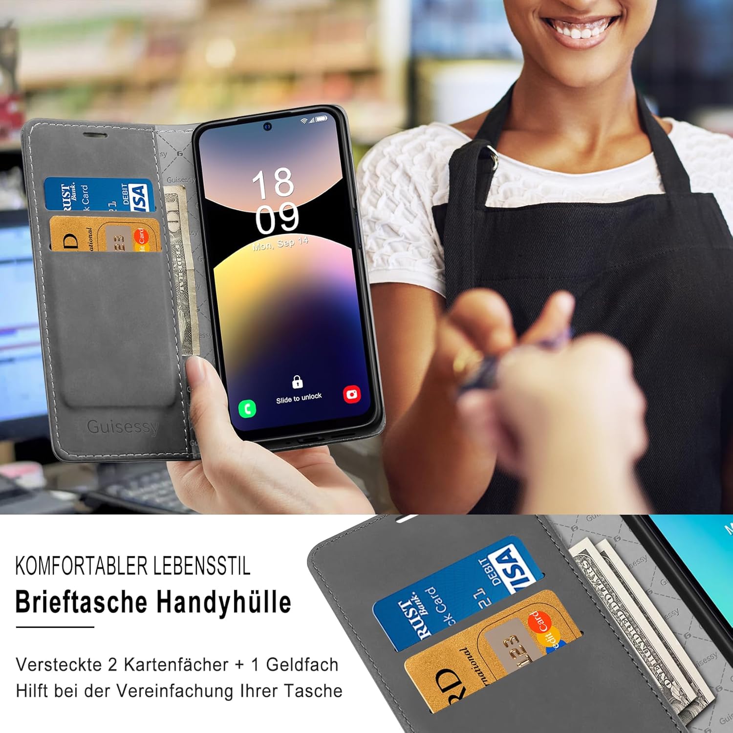 • Вградено магнитно закопчаване: Калъфът за мобилен телефон Guisessy за Samsung Galaxy S25 FE има вградено магнитно закопчаване, може лесно да се отваря и затваря, прави използването на телефона по-лесно и удобно. Вграденото силно магнитно закопчаване подобрява магнитната връзка, предпазва телефона ви, когато не се използва, като ефективно предотвратява случайно отваряне на калъфа.