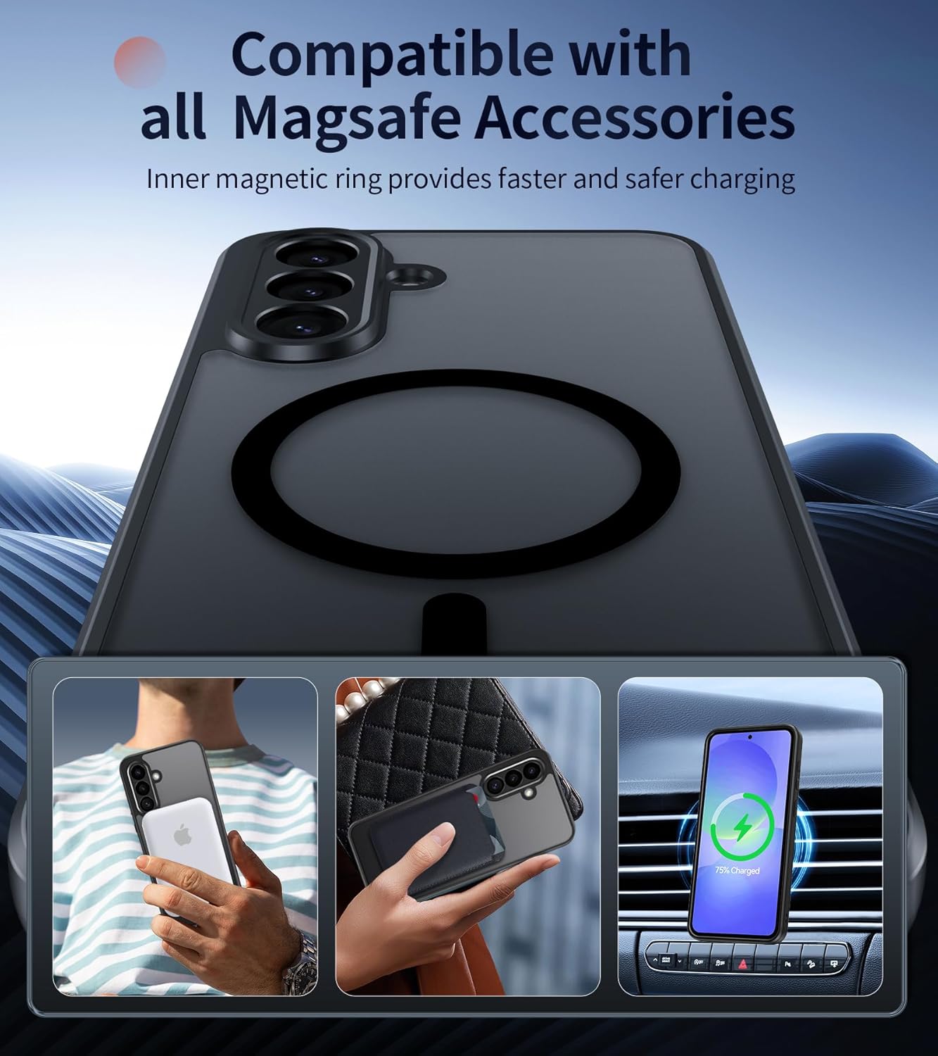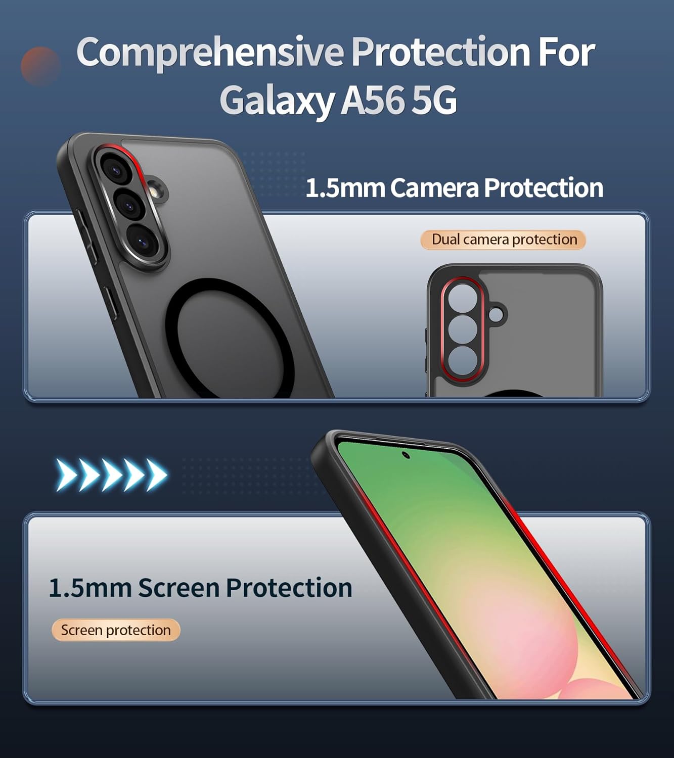 Калъф за Samsung Galaxy A56 5G, съвместим с MagSafe с 2 протектора за екран, [Пълна защита на камерата], Удароустойчив, прозрачен матов защитен калъф, черен