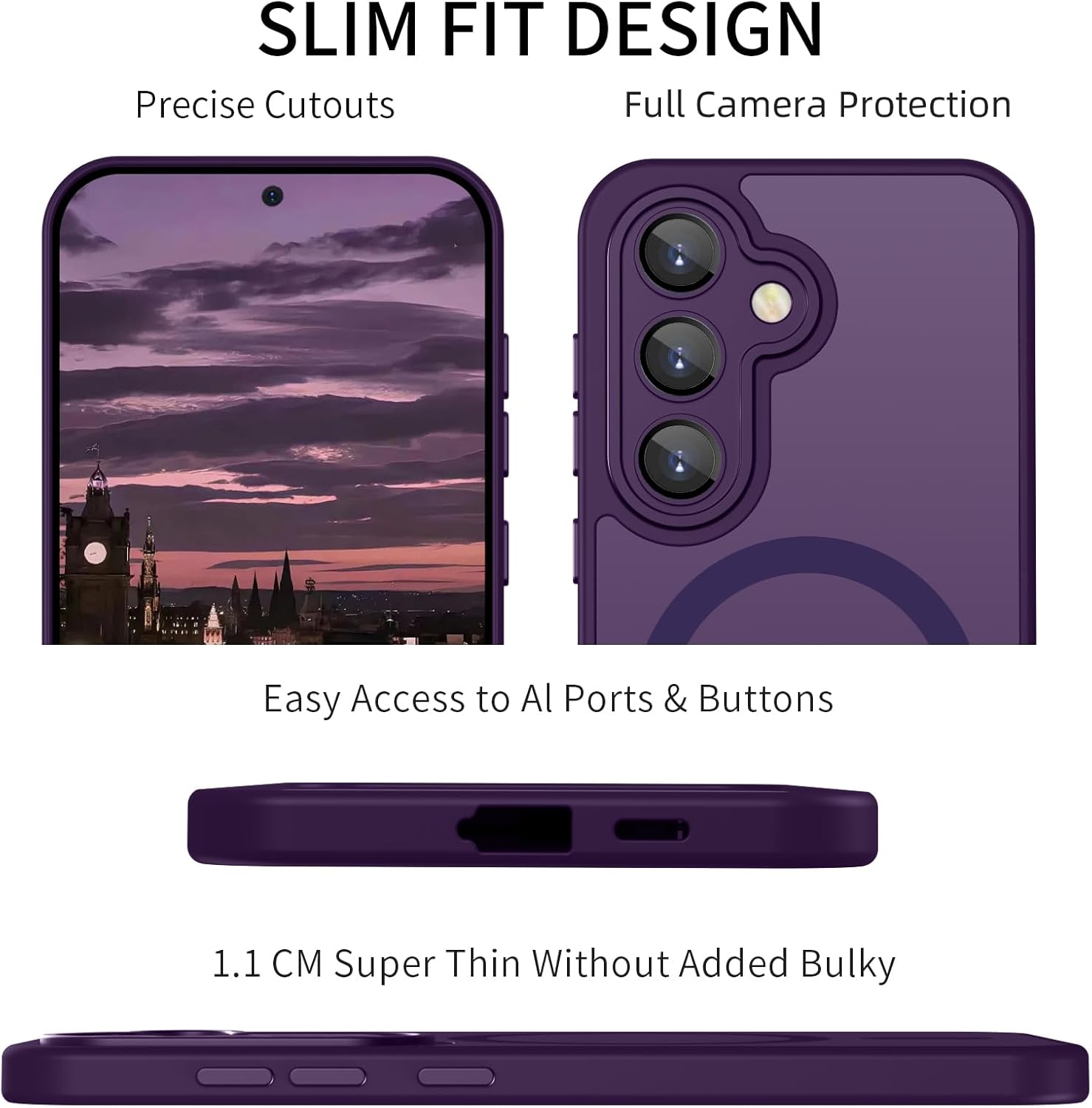 • Slim fit дизайн: стилният, тънък дизайн и мекият защитен материал осигуряват адекватна защита за вашия Samsung Galaxy S24 от драскотини, удари, пръстови отпечатъци и замърсявания. Вграденият мощен магнит позволява по-бързо и лесно безжично зареждане и сигурно закрепване към магнитни аксесоари. Също така перфектно се съчетава с други магнитни аксесоари.