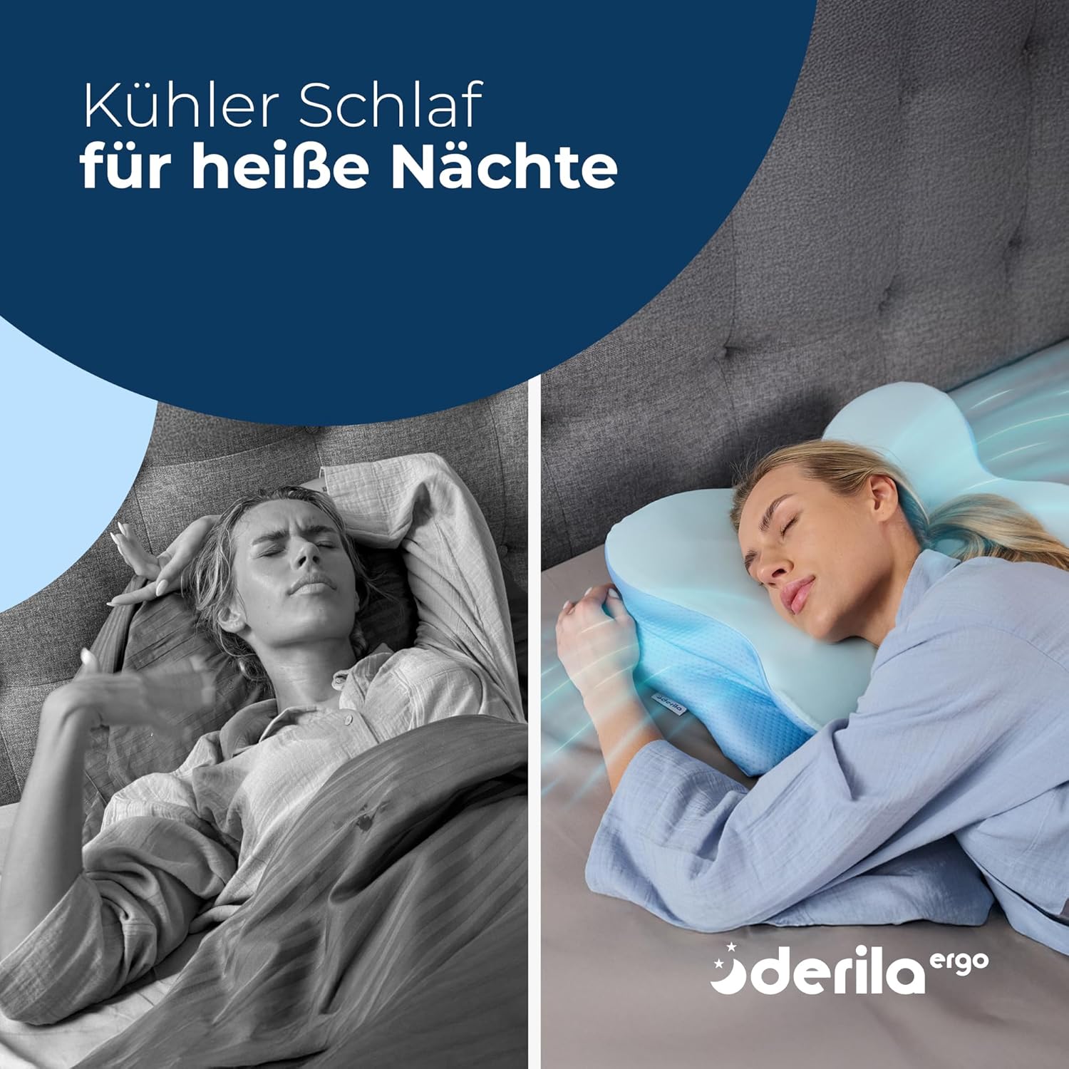 • Възглавницата от мемори пяна Derila ERGO насърчава по-доброто дишане, като допринася за правилното подравняване на главата и врата. Ергономичният ѝ дизайн може да помогне за създаването на по-спокойна и тиха среда за сън.