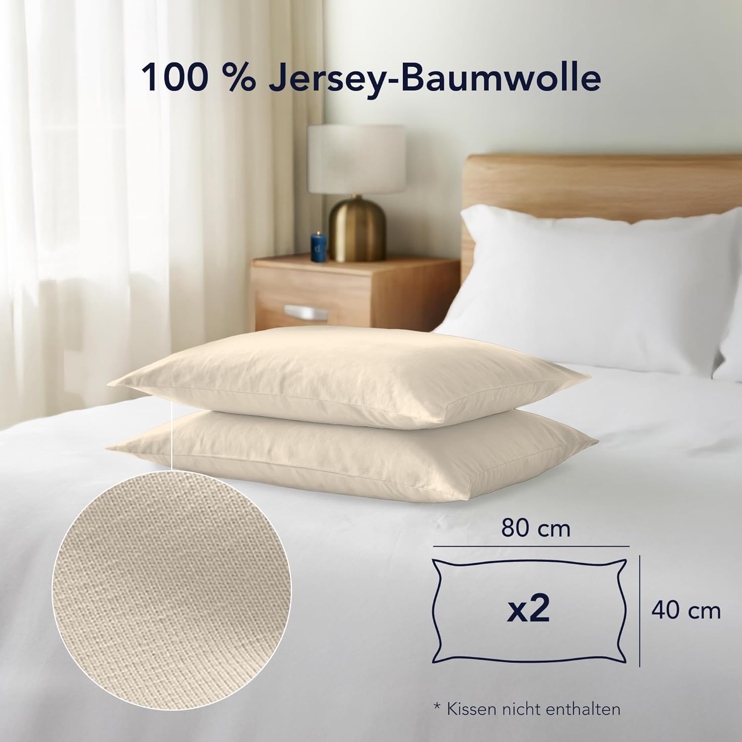 Калъфки за възглавници Dreamzie, 40 x 80 см (Комплект от 2), 100% памук Джърси, 150 г/м² Бежови, Устойчиви и хипоалергенни