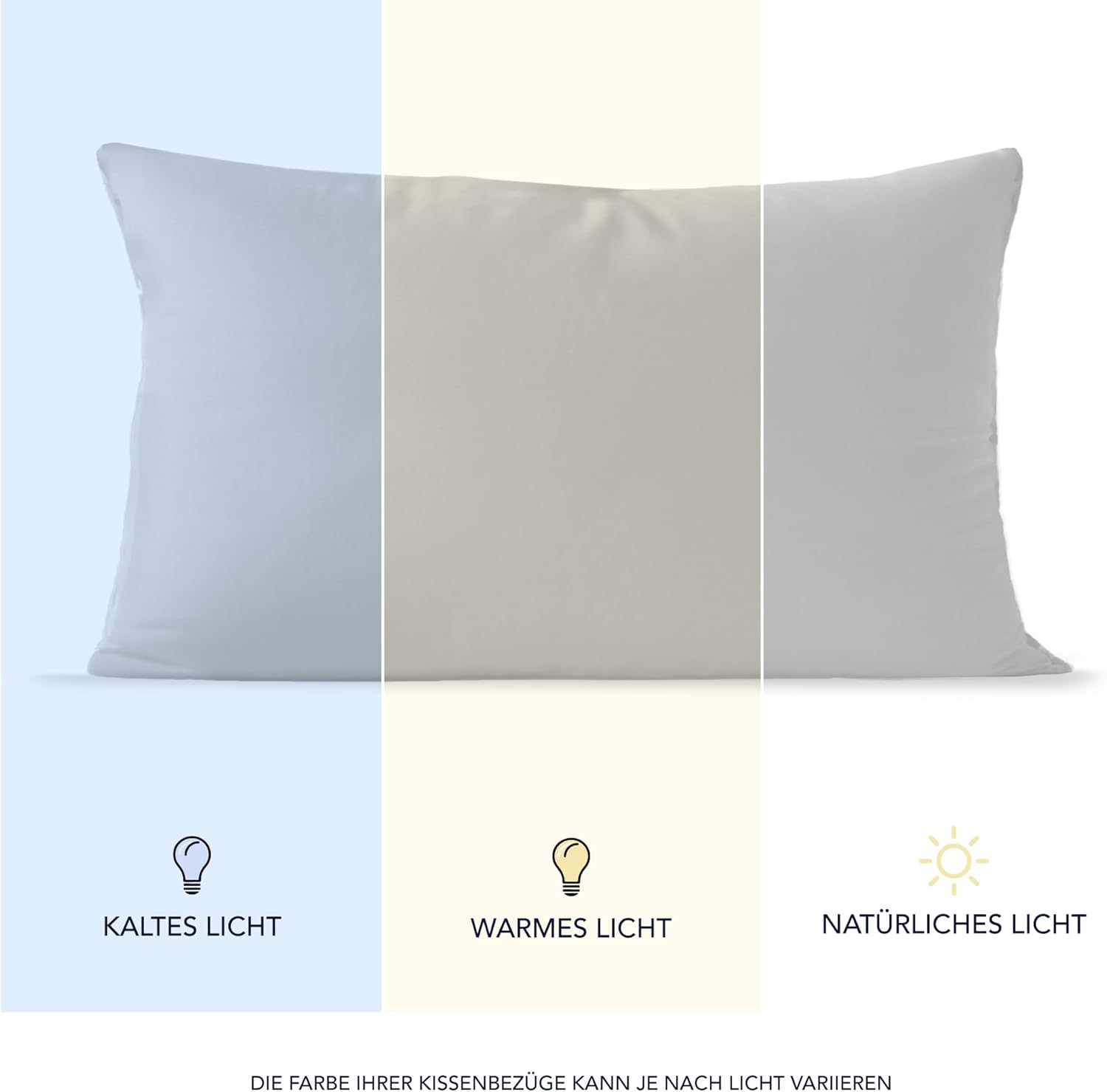 • Дизайн и лесна грижа – естествената елегантност на памука в комбинация с неговата простота позволява на тази калъфка за възглавница с размери 40 x 80 см да се впише перфектно във всяка спалня. Вечните комплекти се предлагат в 6 цвята (бяло, черно, сиво, антрацит, бежово, синьо, червено, тъмносиньо) и се вписват идеално и в декоративната всекидневна. Калъфките за възглавници се перет лесно: в пералня на 60°C.