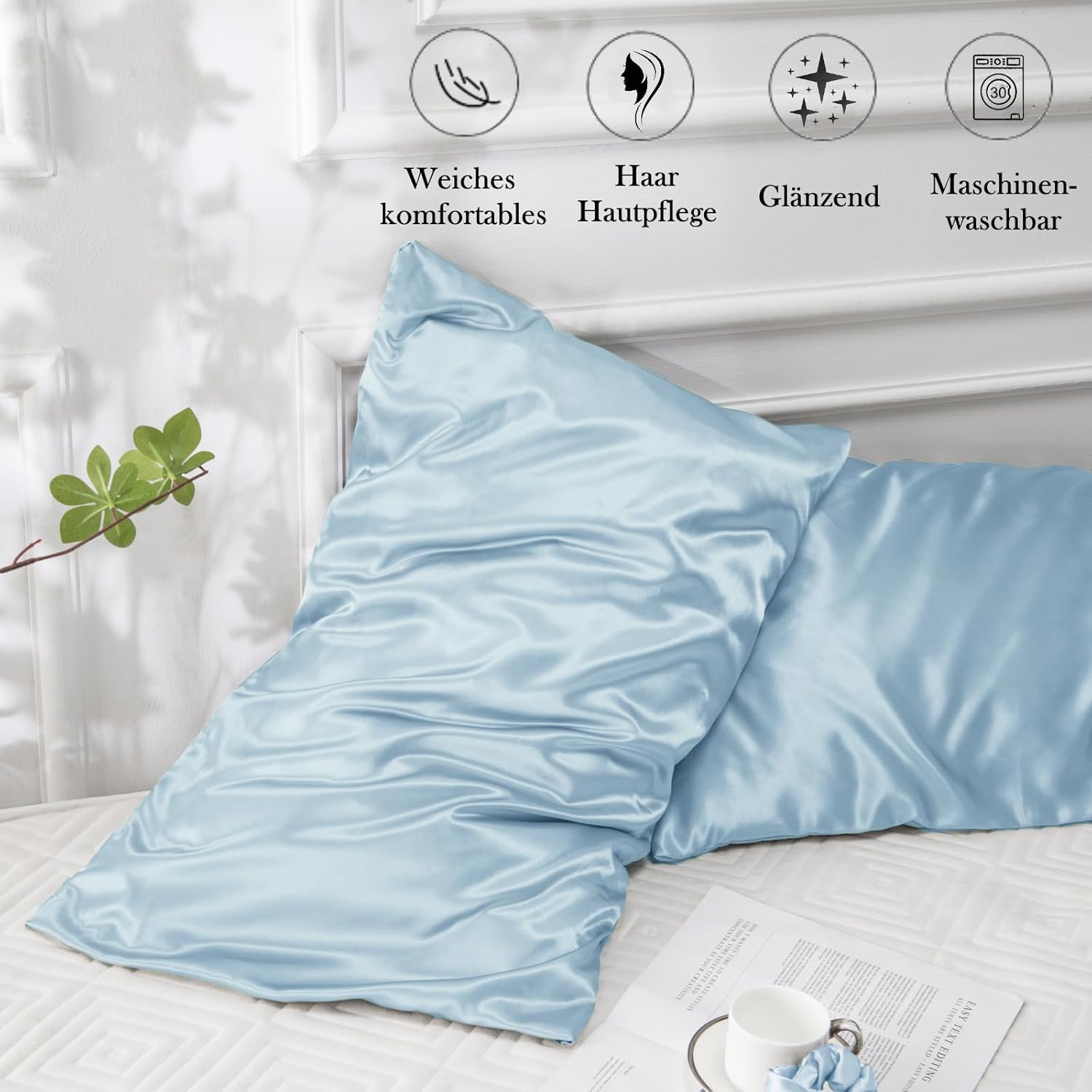 Калъфки за възглавници Vielit от сатен, комплект от 2, 50 x 70 см, светлосини, меки като коприна, лесни за поддръжка, калъфка за коса и кожа, с 2 ластика за коса