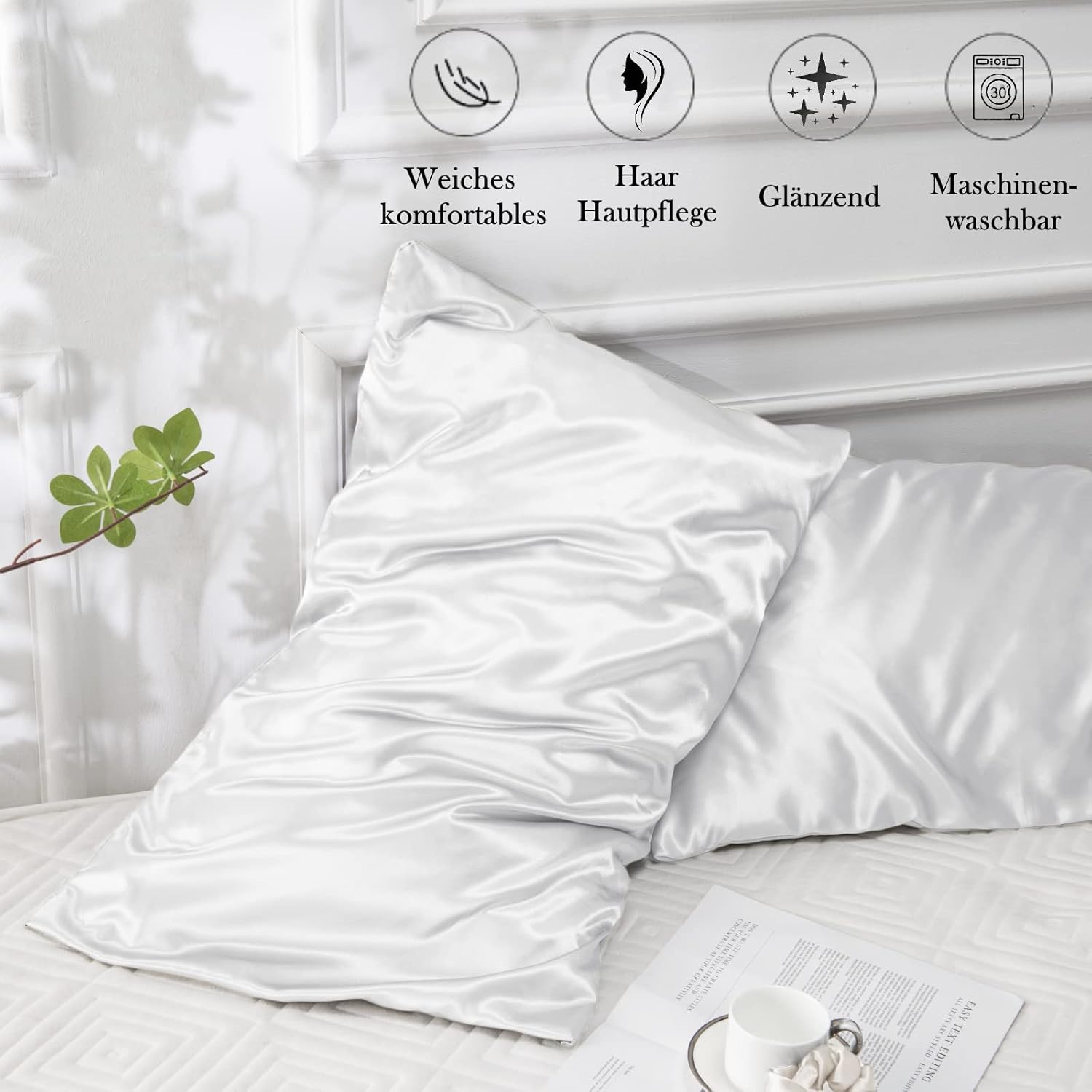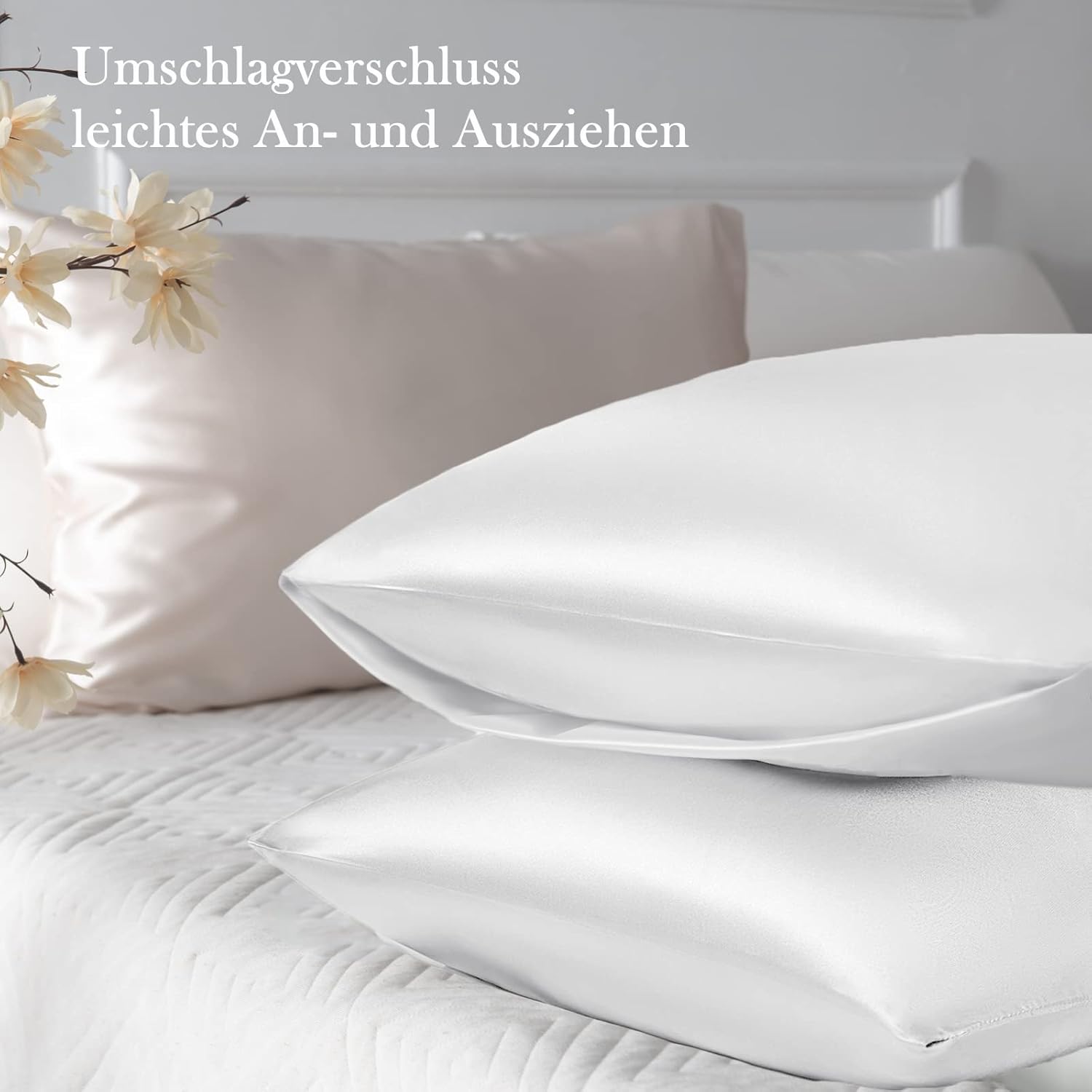 Калъфки за възглавници Vielit от сатен, комплект от 2, 70 x 40 см, бели, меки като коприна, лесни за поддръжка, за коса и кожа, в комплект с 2 ластика за коса