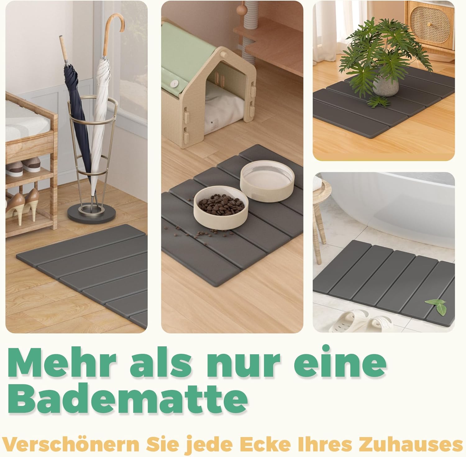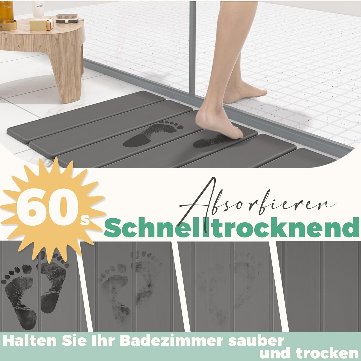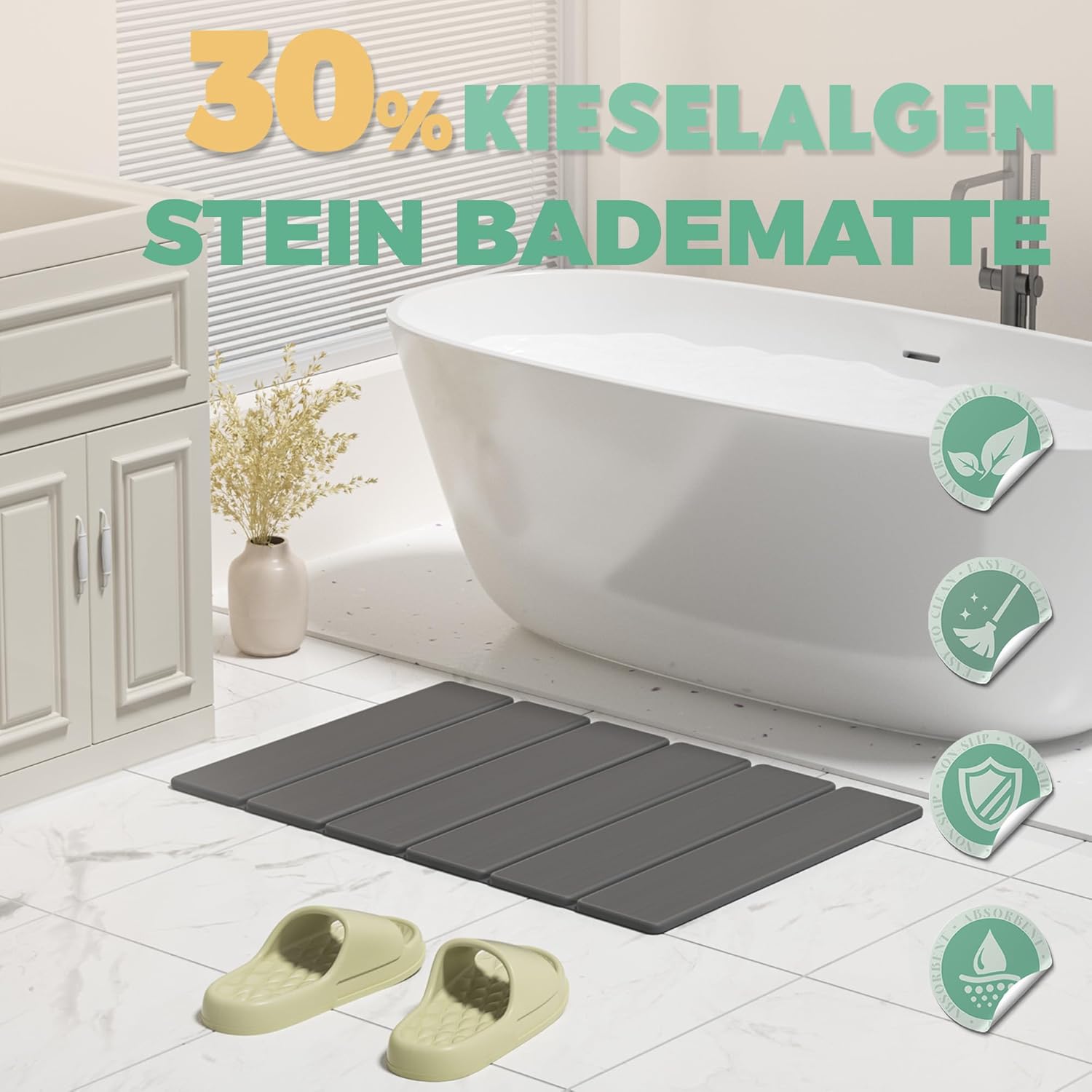 • Постелка за баня от диатомит: каменната постелката е изработена от естествен диатомит, който е нетоксичен и без мирис, безопасен и здравословен, предпазва краката ви и ви предлага естествено комфортно изживяване. Самата диатомитна пръст има естествено водопоглъщане, така че банята ви никога няма да бъде влажна и създава суха и комфортна среда.