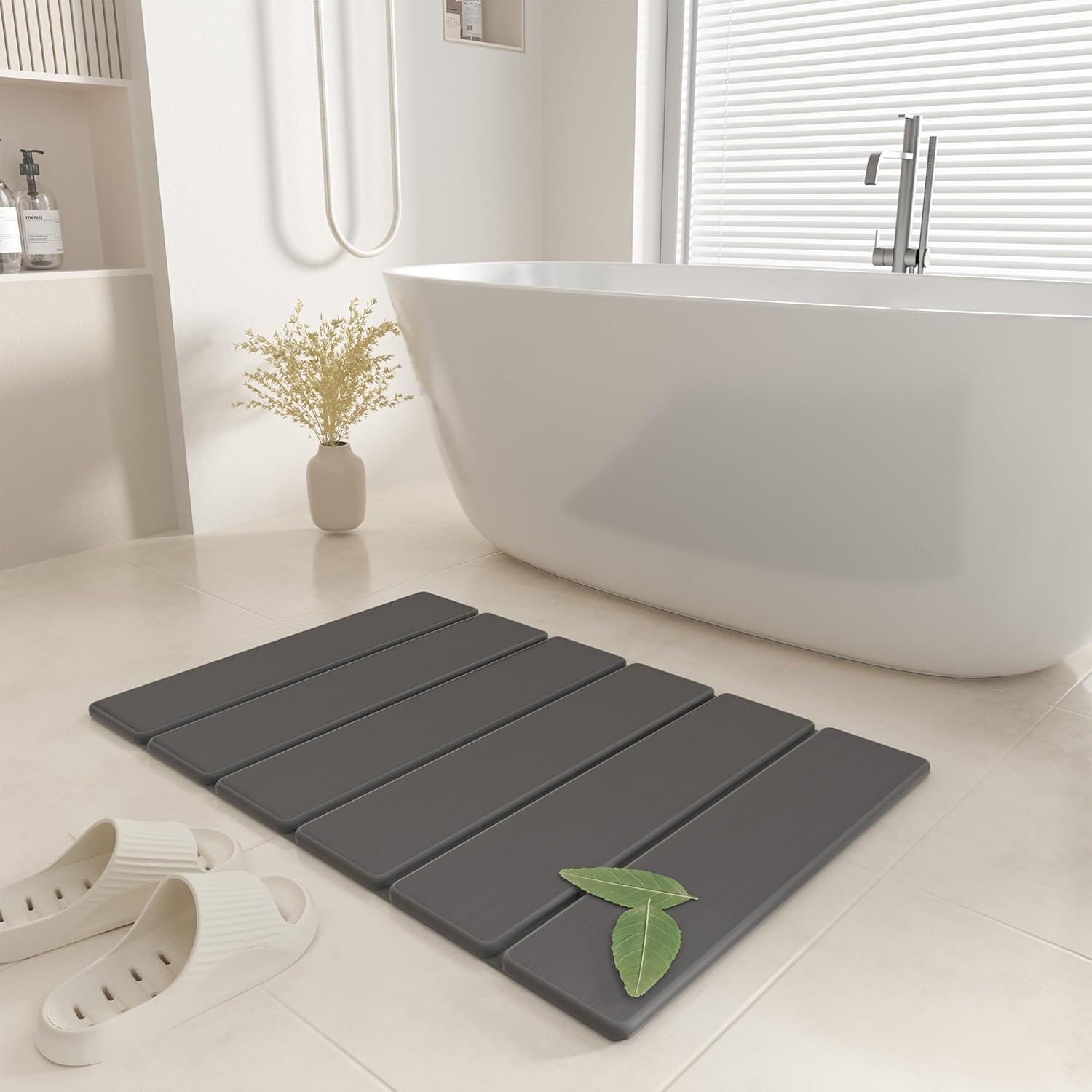 Каменна постелка за баня, 60 см сгъваема постелка за баня от диатомит, супер абсорбираща, бързосъхнеща, неплъзгаща се за баня, лесна за почистване, сива