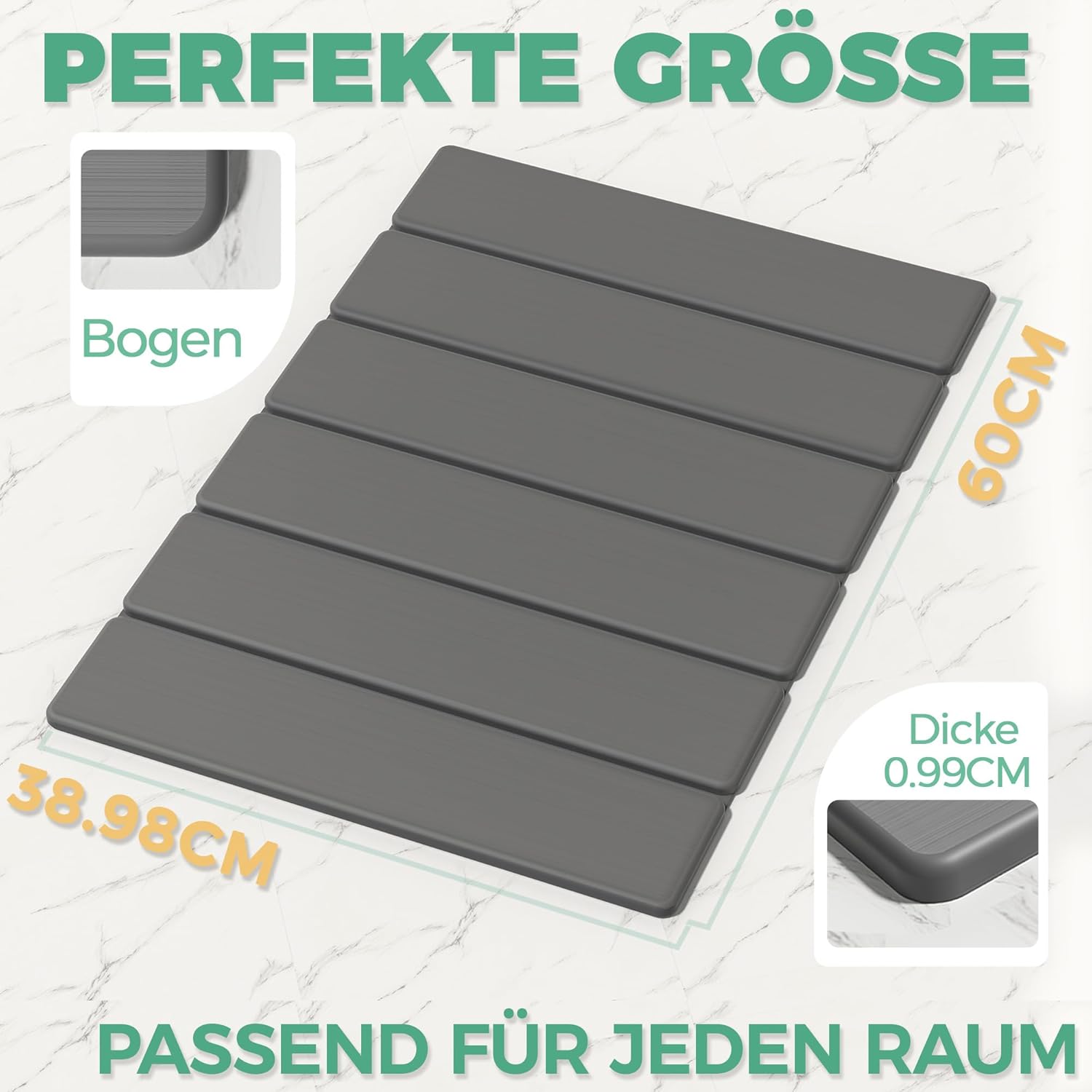 • Инструкции за каменна постелка за баня: Размер: 60 x 39 x 1 см. За да осигурите най-добрата употреба на сивата постелка за баня, моля, не я излагайте на слънце. Препоръчително е да поставите бързосъхнещата постелка за баня на проветриво и сухо място, за да избегнете влажна среда. Моля, отстранявайте петната от вода навреме след употреба, за да избегнете повлияване на способността за абсорбиране на вода от дълготрайни петна от вода.