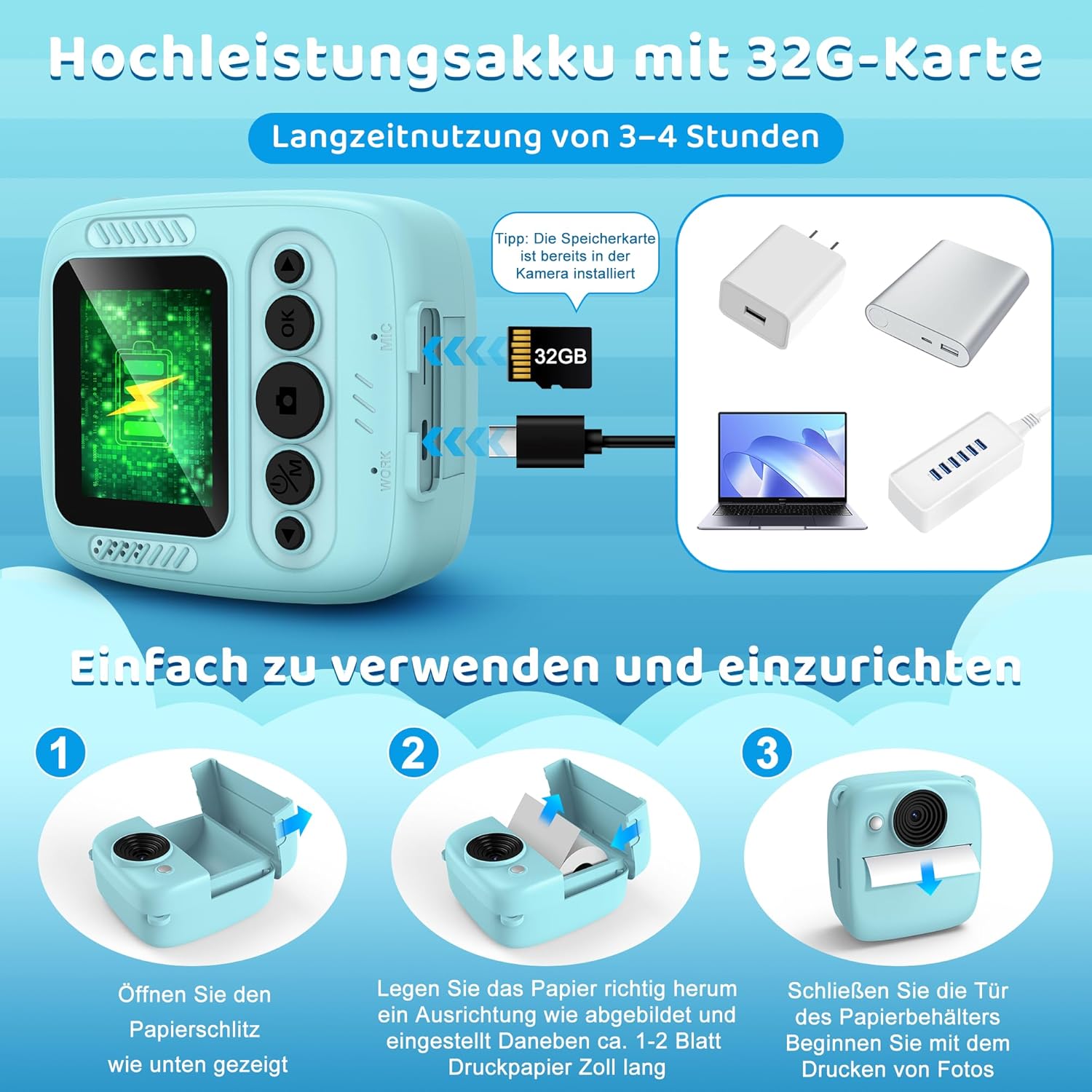 • Безопасна технология за термопечат и HD качество на изображението: използваме екологична технология за термопечат, за да гарантираме безопасността на детските фотоапарати и хартиени материали. А с висока резолюция от 48MP и 1080P видеозапис, вашите деца могат да запечатат всеки динамичен момент. Подходящо е за момчета и момичета на възраст от 3 до 12 години, за да имат ежедневни записи за срещи с приятели, училищен къмпинг, дейности на открито, училищни партита, семейни събирания и пътувания с родители с малки ръце.