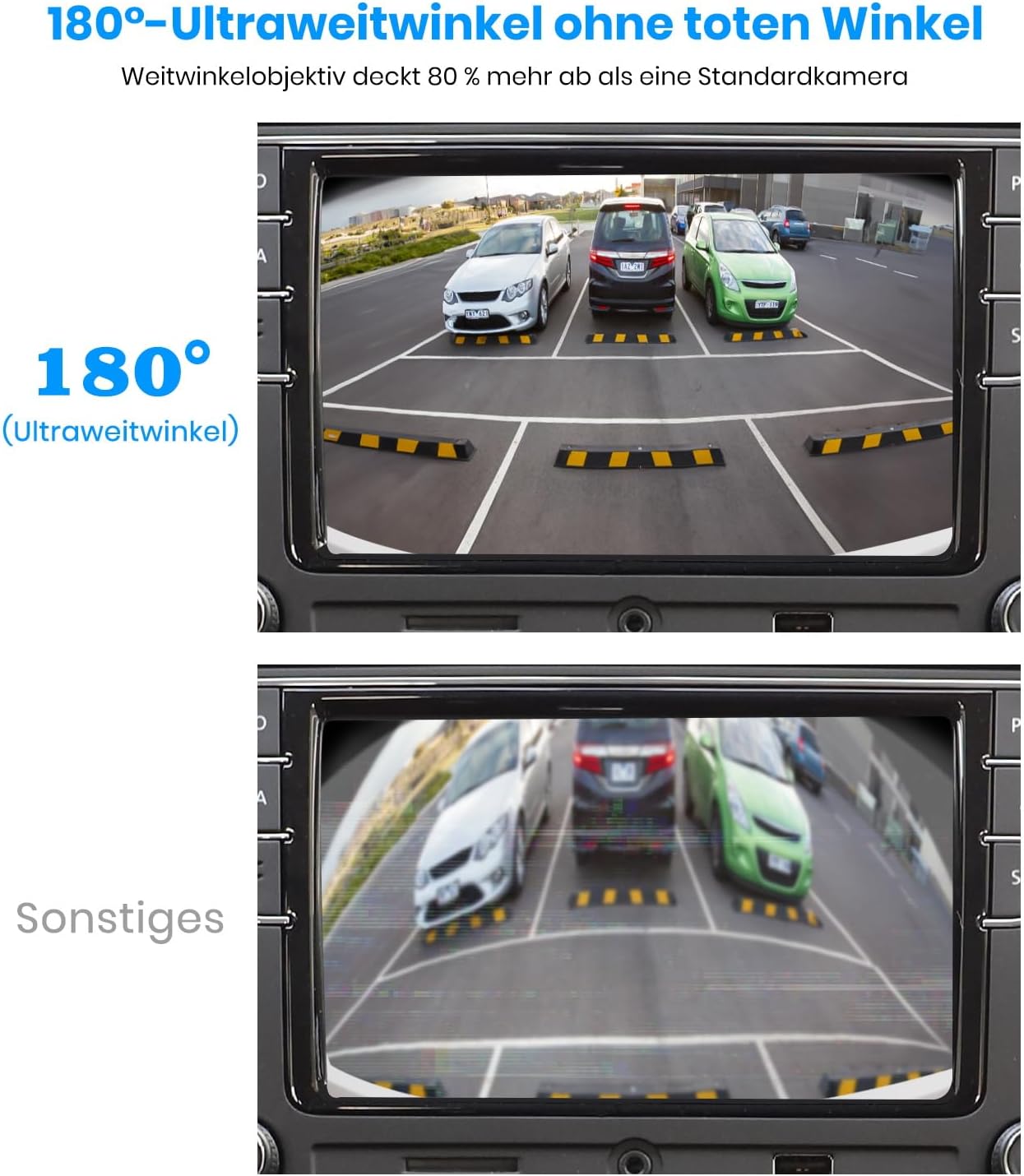 • Безопасно и безгрижно: 180° супер широкоъгълен изглед без ефект „рибешко око“! Камерата за заден ход на автомобила заснема огромна зона зад автомобила ви. Това ви дава пълен обзор и ви позволява да паркирате безопасно и лесно, дори в трудни ситуации.