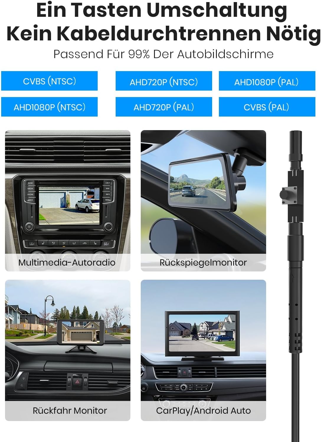 • 6 видео системи с едно натискане на бутон: Модернизирайте камера за заден ход с почти всеки монитор на превозно средство! Превключвайте мигновено между CVBS (NTSC/PAL) и AHD 1080P/720P (NTSC/PAL) с едно натискане на бутон. Работи с дисплея на автомобилното ви радио, CarPlay, отделен монитор на автомобила, монитор на огледалото за обратно виждане и много други. Никога повече няма да имате проблеми със сигнала!
