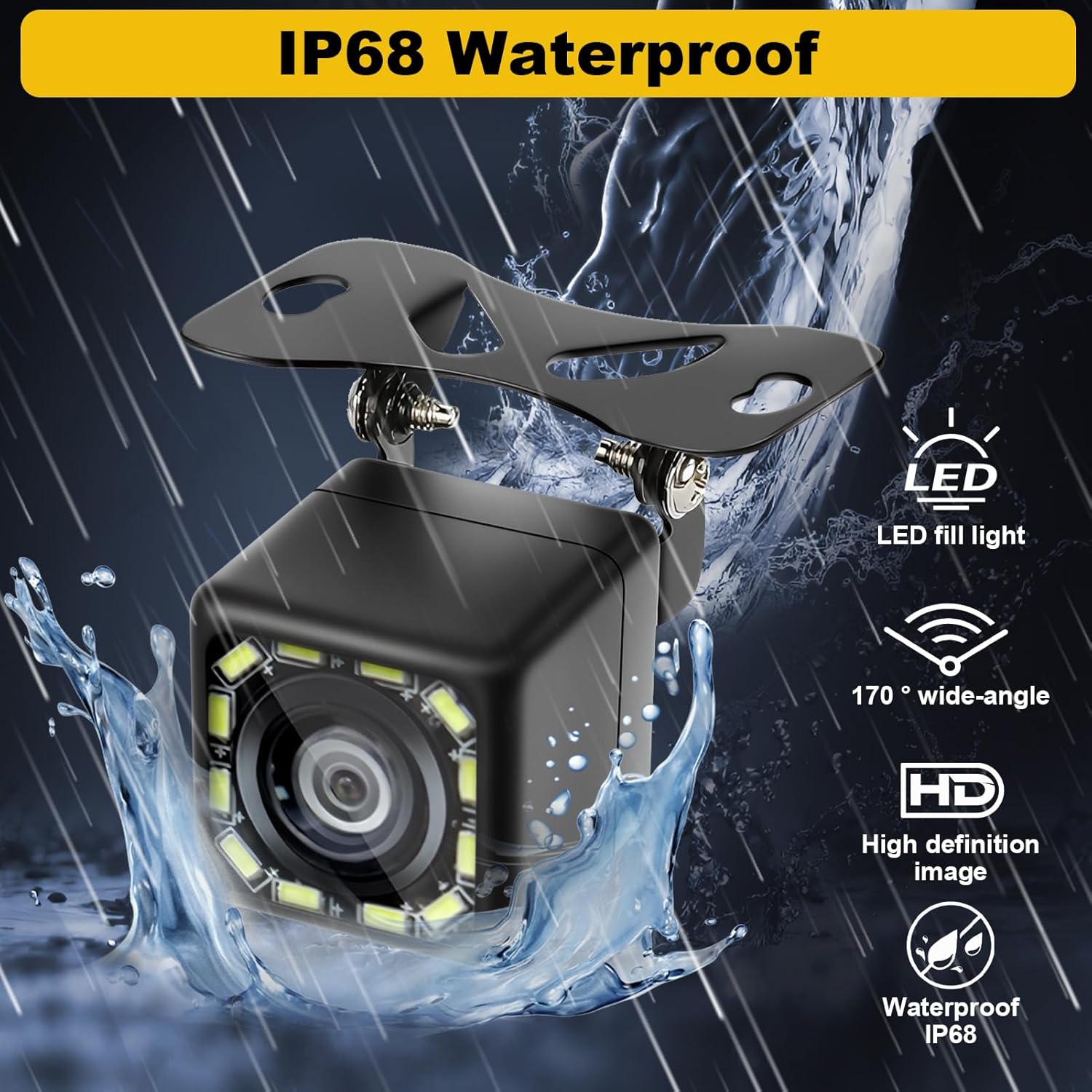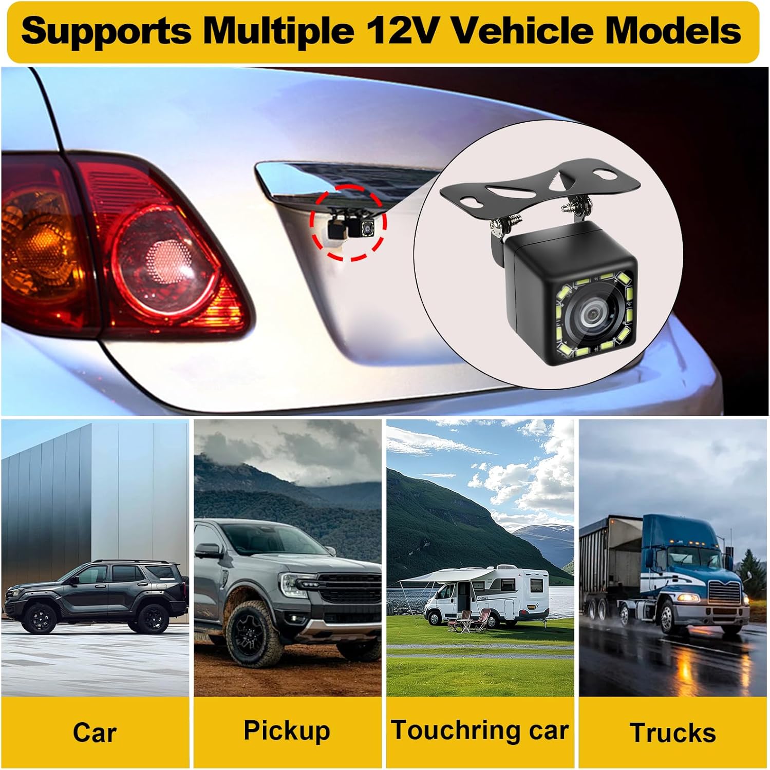 Камерата за заден ход осигурява ясна видимост назад и помага при безопасно паркиране, движение на заден ход и маневриране. С резолюция 1080p HD и широкоъгълен обектив от 170° можете да виждате дори големи зони от шофирането си. 12-те вградени светодиода осигуряват отлично нощно виждане.