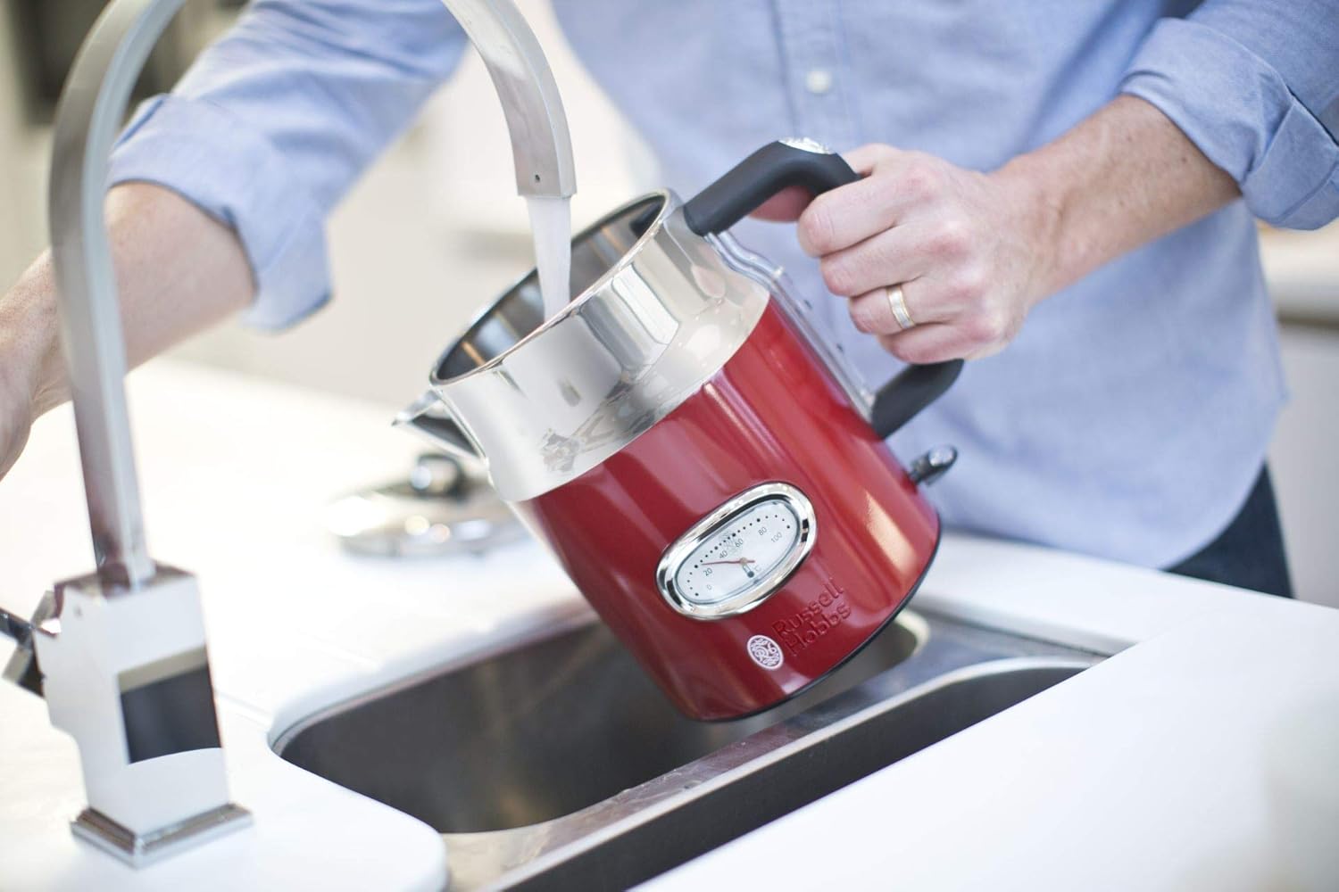 Кана Russell Hobbs [1.7l, 2400W] Ретро червена и полирана неръждаема стомана (функция за бързо кипване, ретро дисплей за температура на водата, външен индикатор за нивото на водата) Винтидж кана за чай 21670-70