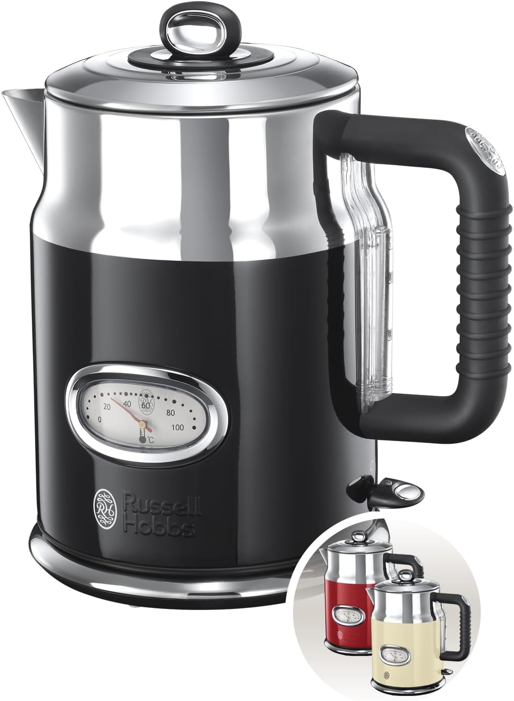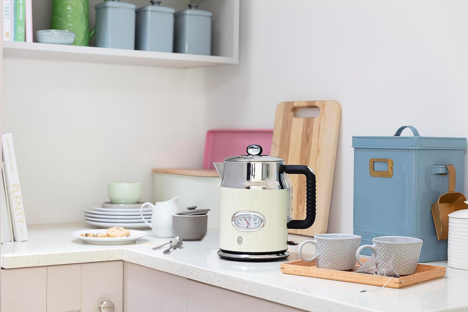 Кана Russell Hobbs [1.7l, 2400W] Ретро кремава и полирана неръждаема стомана (функция за бързо кипване, дисплей за температура на водата в ретро дизайн, външен индикатор за нивото на водата) Винтидж кана за чай 21672-70