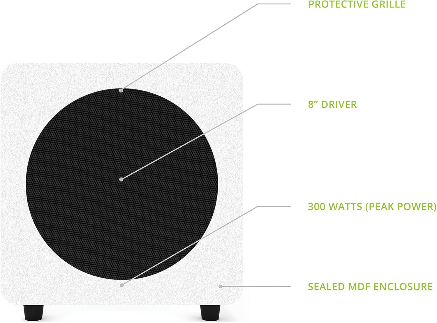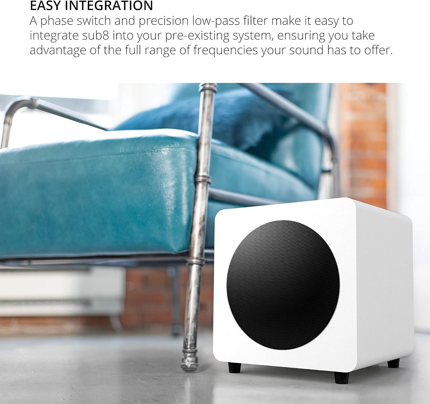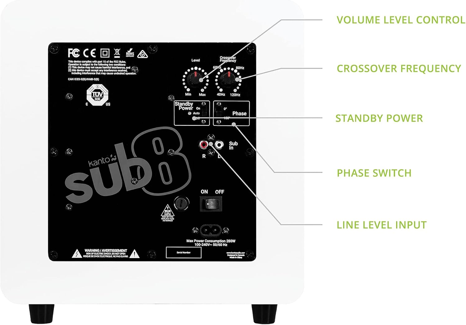 Sub8 ви дава скоростта и точността, които само един запечатан субуфер може да осигури. 8-инчов нискочестотен говорител, задвижван от 300-ватов усилвател, реагира бързо на преходни процеси и свежда изкривяванията до минимум. Компактният му размер осигурява звук с пълен диапазон, без да се жертва пространството на пода, а кросоувър филтър и фазов контрол позволяват лесна интеграция във всяка аудио система. Sub8 осигурява безпроблемна дълготрайност със своята твърда MDF конструкция, здрави гумени крачета, метална решетка и издръжливо винилово покритие. С подходяща естетика, sub8 е идеалният спътник за всеки високоговорител Kanto или където и да е необходим стегнат бас в тясно пространство.