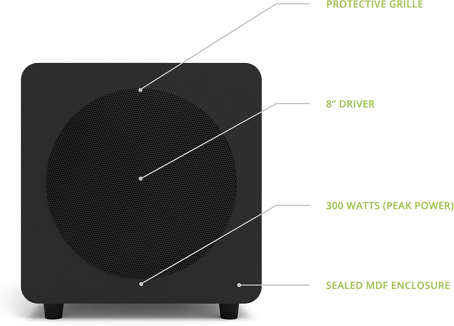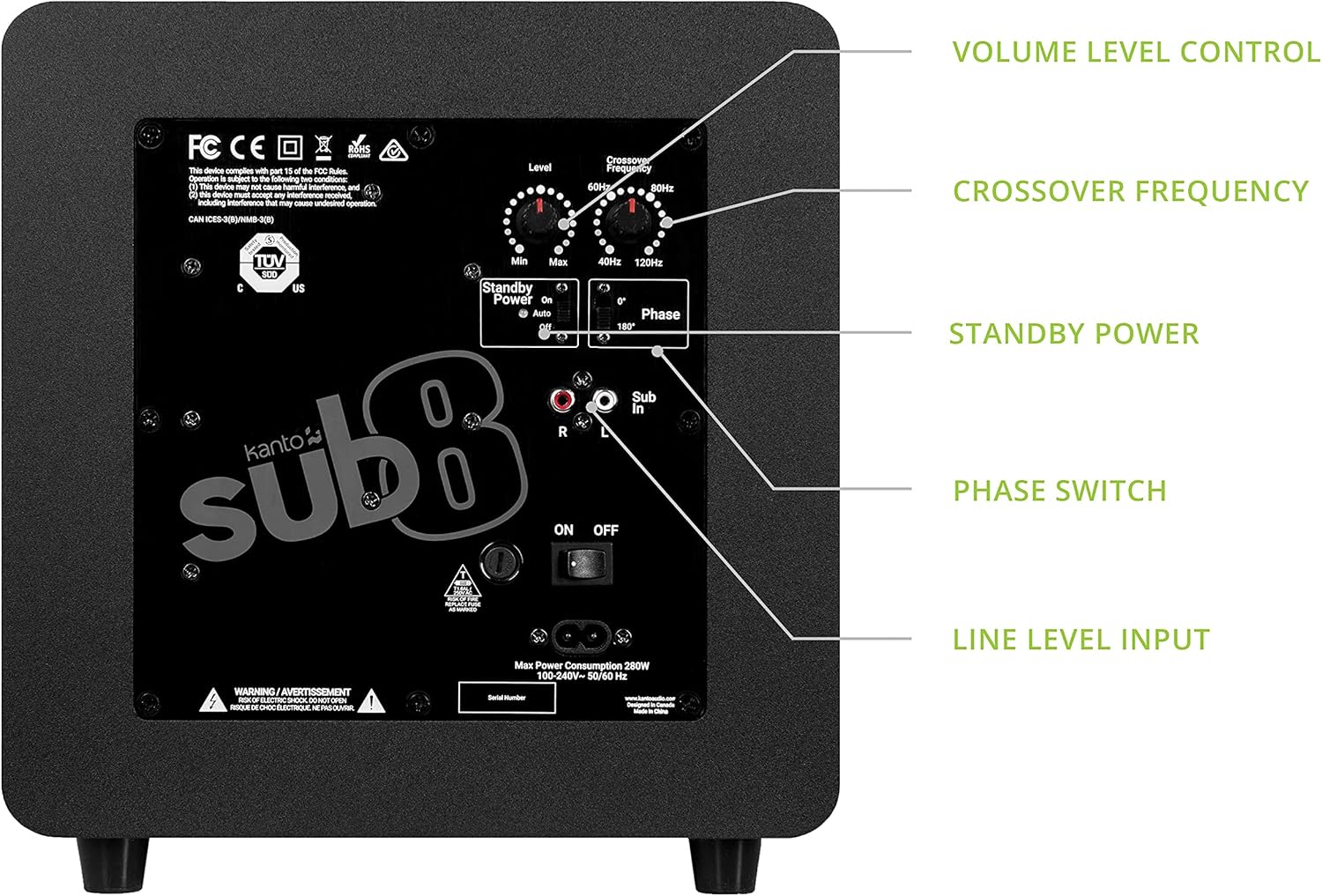 Sub8 ви дава скоростта и точността, които само един запечатан субуфер може да осигури. 8-инчов нискочестотен говорител, задвижван от 300-ватов усилвател, реагира бързо на преходни процеси и свежда изкривяванията до минимум. Компактният му размер осигурява звук с пълен диапазон, без да се жертва пространството на пода, а кросоувър филтър и фазов контрол позволяват лесна интеграция във всяка аудио система. Sub8 осигурява безпроблемна дълготрайност със своята твърда MDF конструкция, здрави гумени крачета, метална решетка и издръжливо винилово покритие. С подходяща естетика, sub8 е идеалният спътник за всеки високоговорител Kanto или където и да е необходим стегнат бас в тясно пространство.