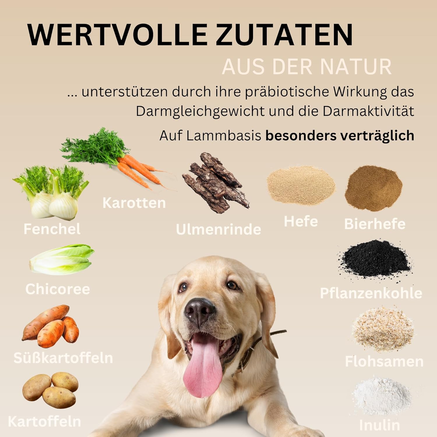 Агнешки протеин*, растителен глицерин, сладък картоф*, картоф*, люспи от псилиум*, хидролизат от мая, бирена мая*, прах от цикория (2,6% = 1,6% инулин), копър*, кора от хлъзгав бряст* (1,5%), растителен въглен, мая** (0,6% = 0,12% MOS) | * изсушен ** екстрахиран