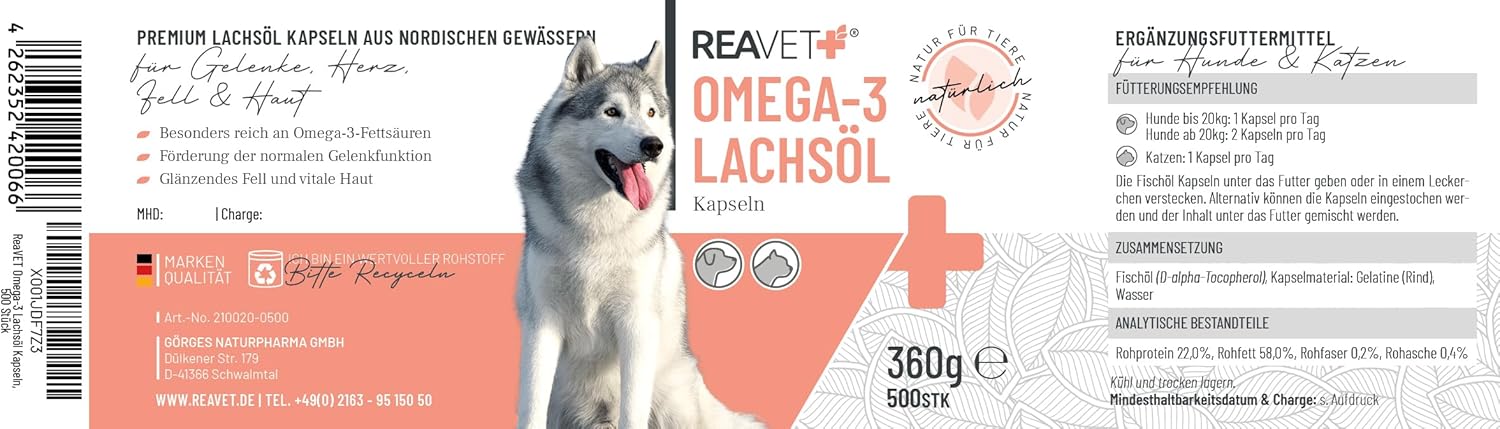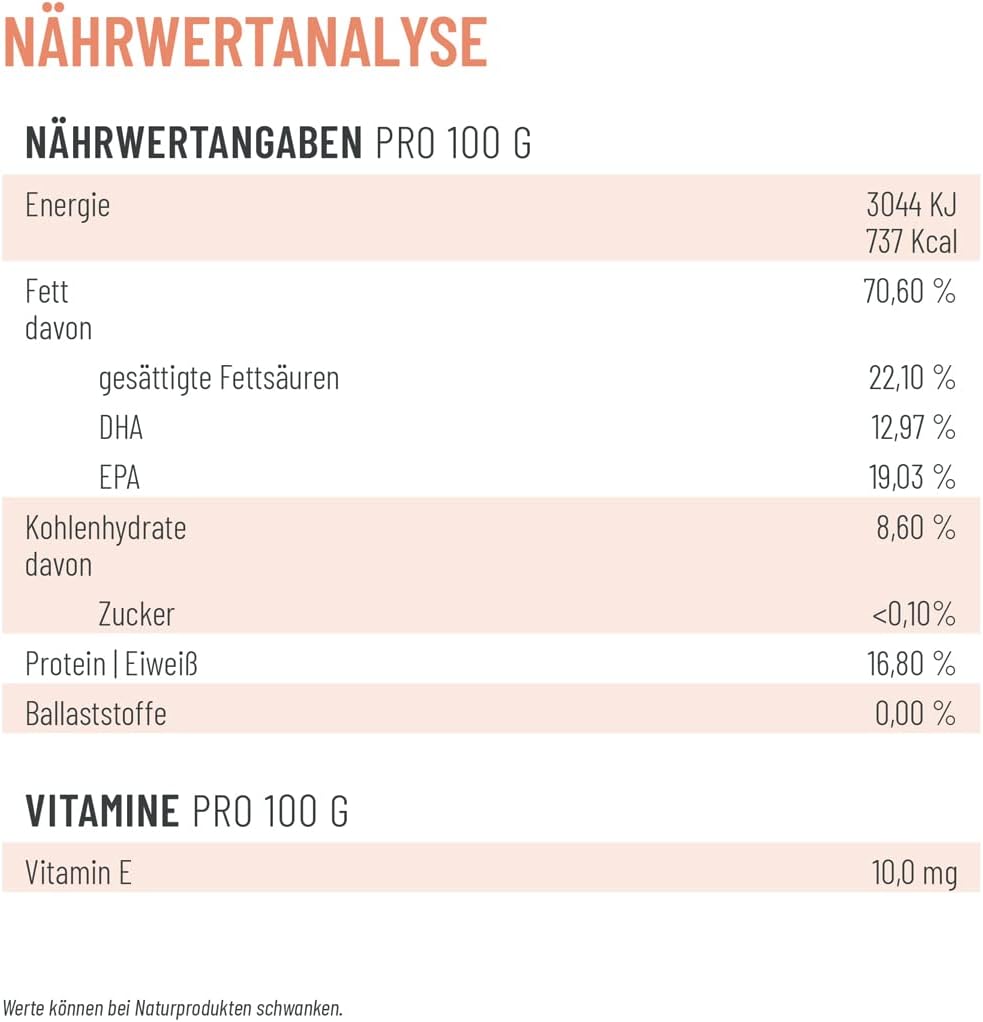 Състав: Рибено масло (D-алфа токоферол), материал на капсулата: желатин (говежди), вода | 500 мг масло от сьомга на капсула | Аналитични съставки: суров протеин 22,0%, сурови мазнини 58,0%, сурови фибри 0,2%, сурова пепел 0,4%