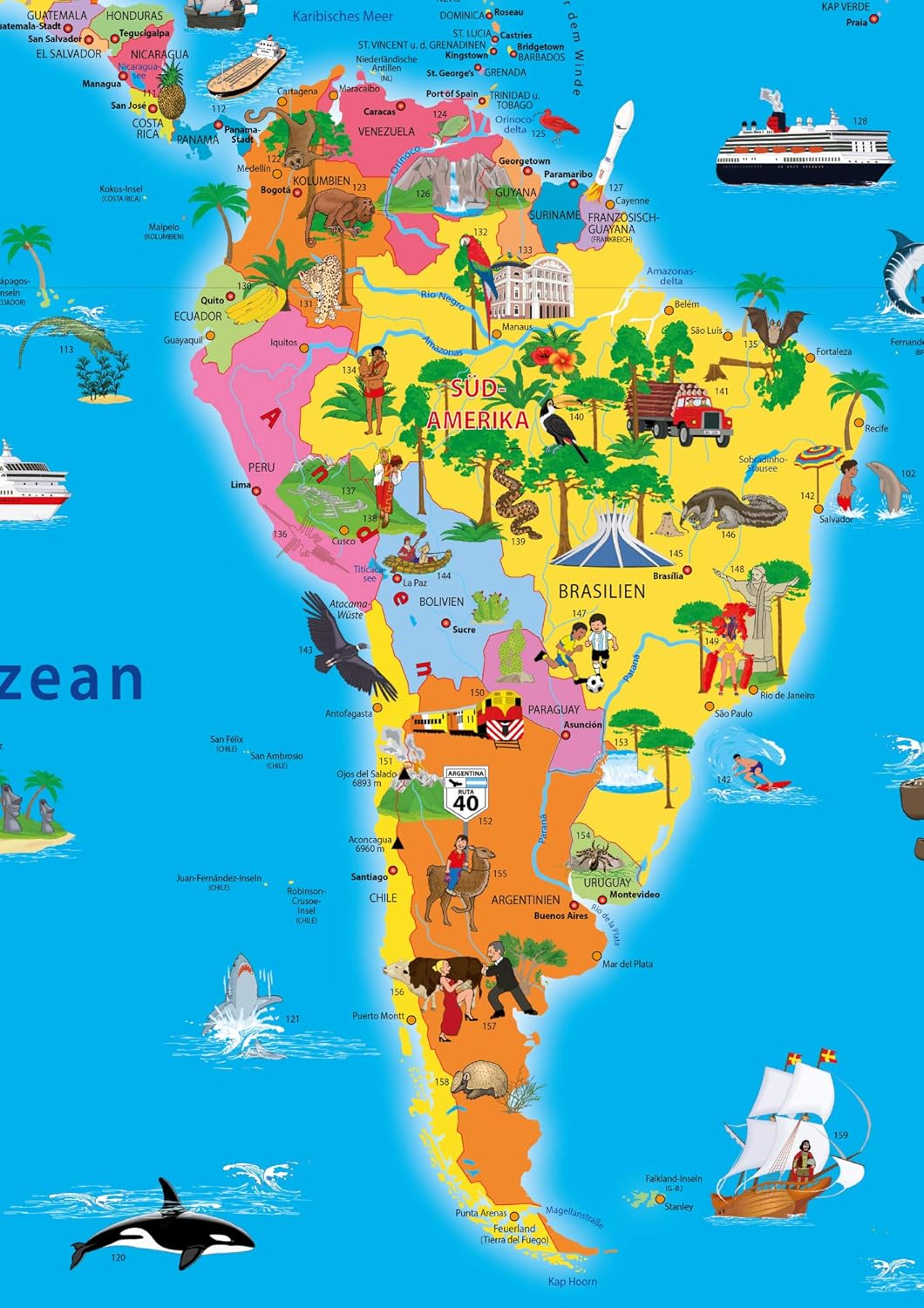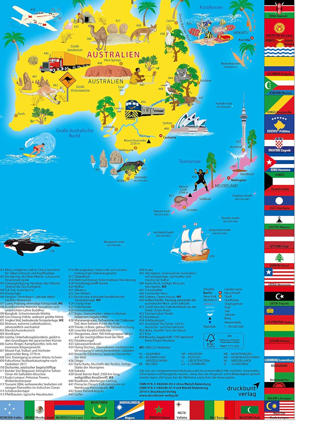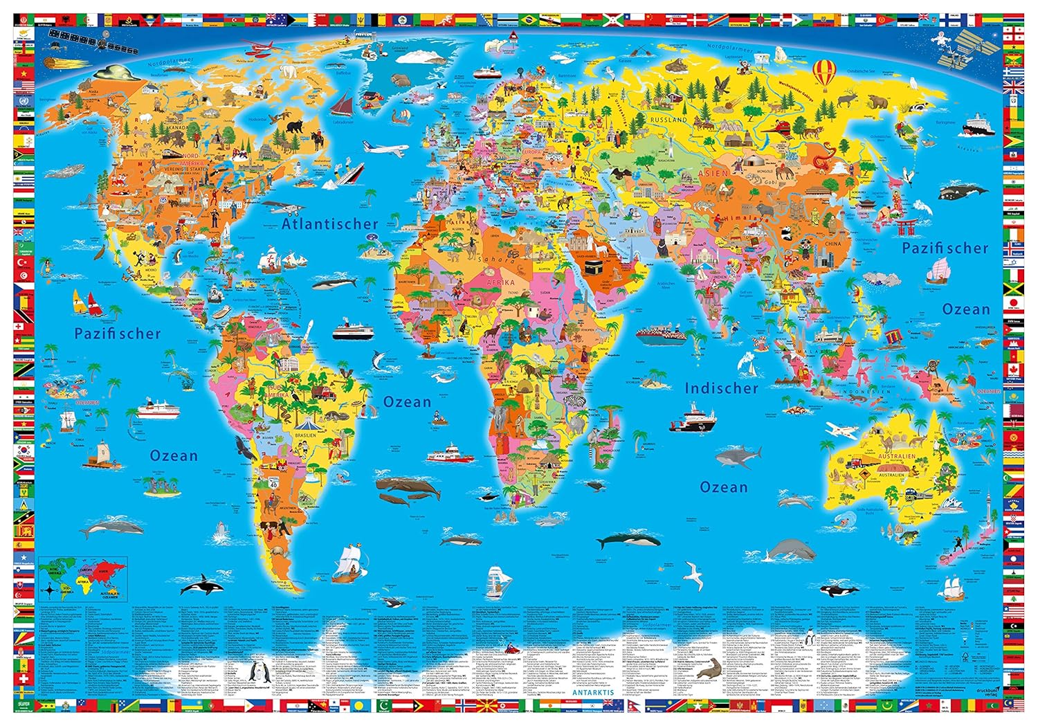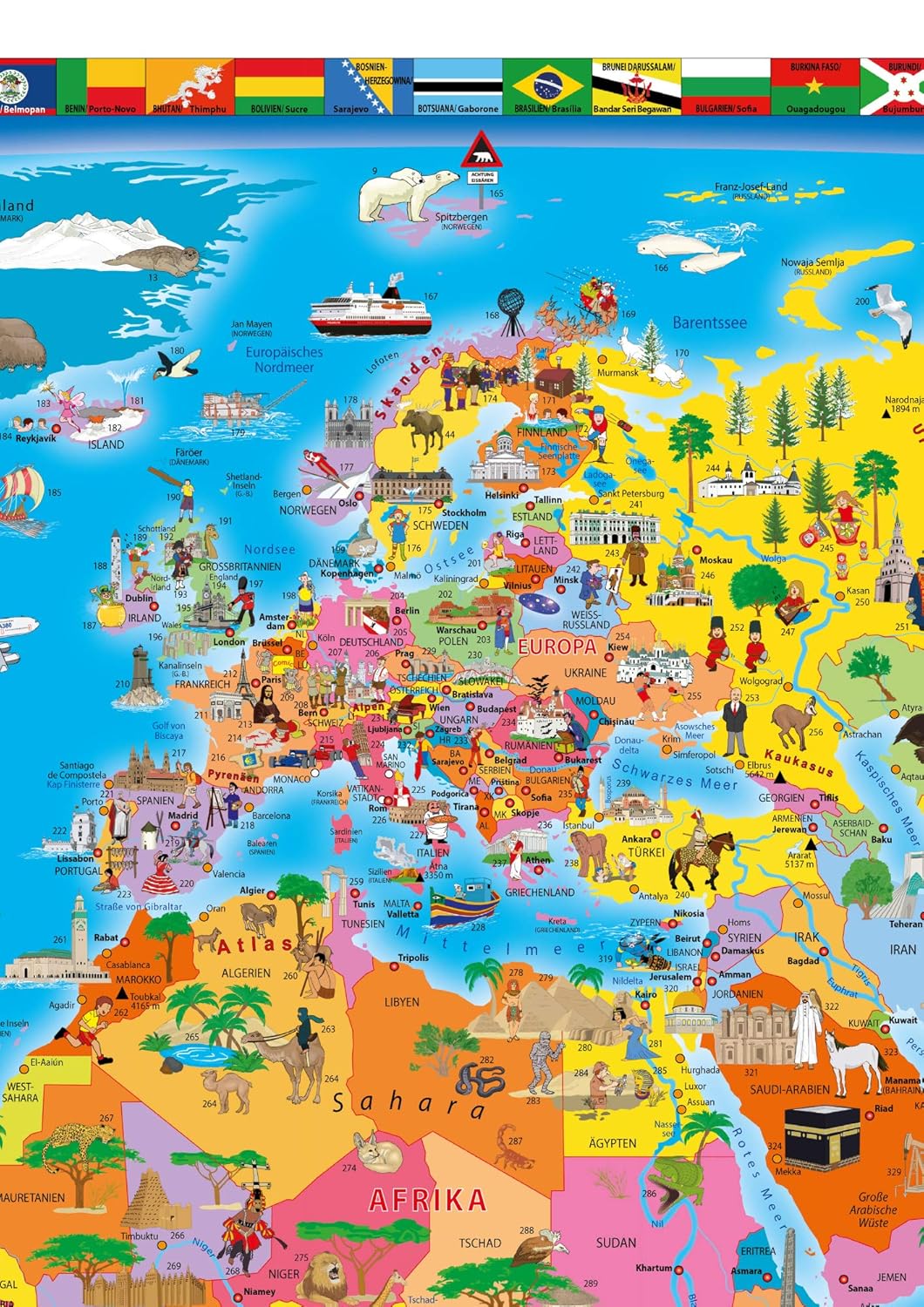 Всички държави с един поглед. Цветово кодиране. Ясна и информативна: Тази нова илюстрирана политическа карта на света за деца и възрастни е завладяваща, актуална, забавна и пълна с ангажиращи, но и образователни факти. Близо 500 ключови точки са обяснени по подходящ за деца начин в долната трета на картата. Възрастните също ще открият нови и интересни аспекти на този висококачествен плакат. Независимо дали е в детска стая, офис, класна стая или лекарски кабинет: Чудесно допълнение към всяка стена и наистина декоративен елемент, който привлича вниманието.