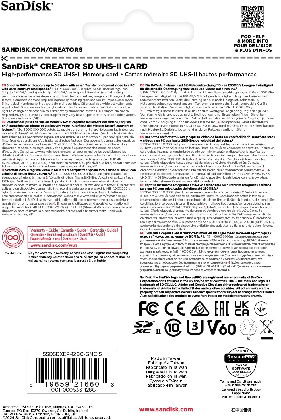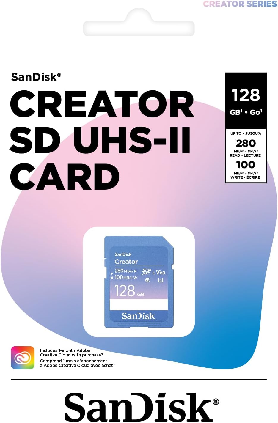 Карта памет SanDisk Creator 128GB SD UHS-II за DSLR и безогледални фотоапарати, 6K видео, V60, UHS-II, 280MB/s четене, RescuePRO Deluxe, Adobe Creative Cloud