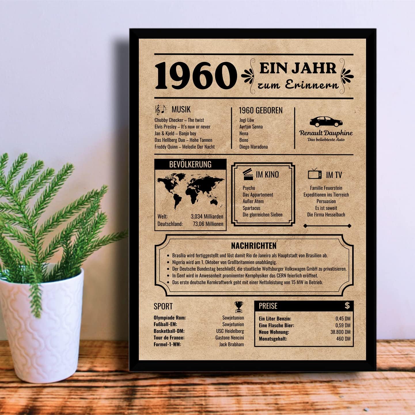 Картичка за рожден ден за родени през 1960 г., украса за рожден ден, подарък за рожден ден, винтидж плакат на немски език, за жени и мъже