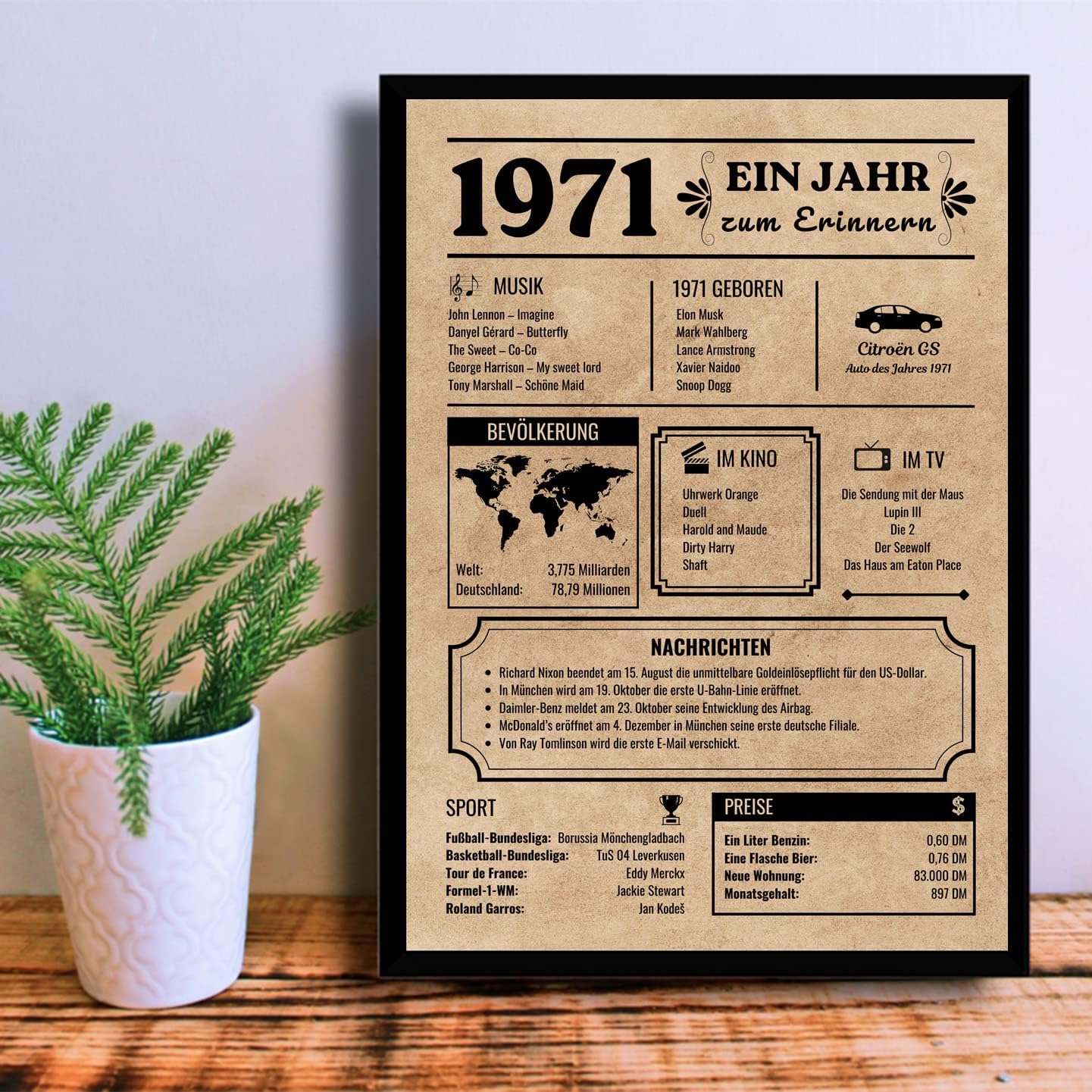 Картичка за рожден ден за родени през 1971 г., украса за рожден ден, подарък за рожден ден, винтидж плакат на немски език, за жени и мъже