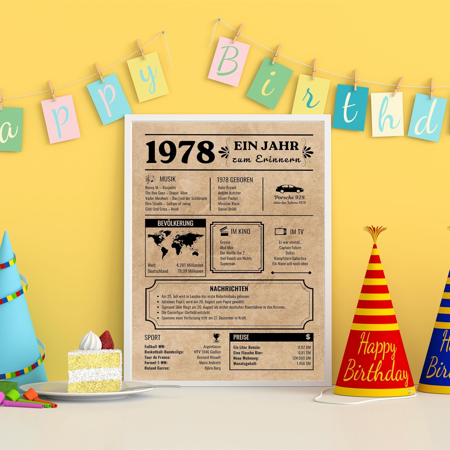 Картичка за рожден ден за родени през 1978 г., украса за рожден ден, подарък за рожден ден, винтидж плакат на немски език, за жени и мъже