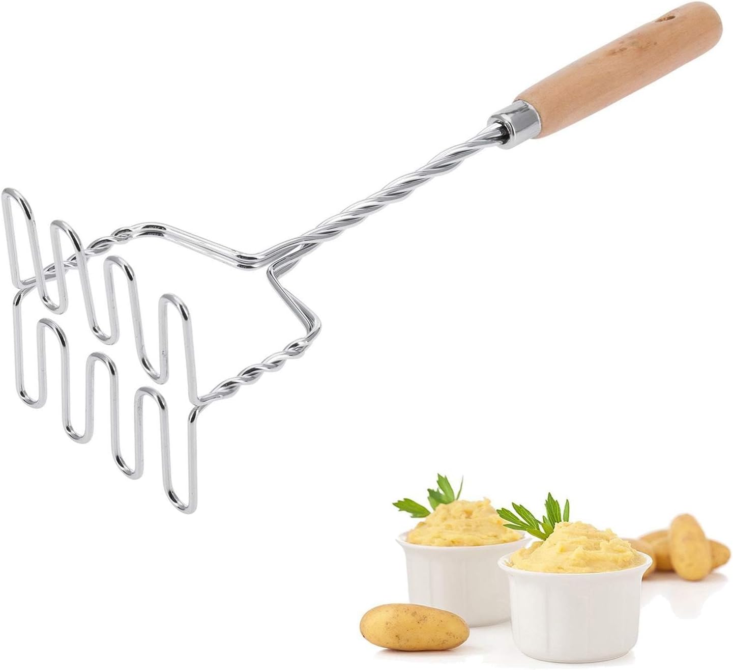 • Картофено преса от неръждаема стомана с квадратни отвори за пасиране на сварени картофи, зеленчуци и плодове в тиган или тенджера.