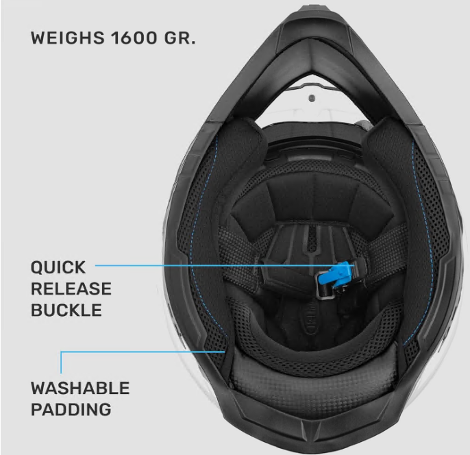 • Ясна визия с визьор механизъм (двоен визьор). Благодарение на ненадрасквания поликарбонатен прозрачен визьор с покритие против запотяване, мотоциклетната каска е подходяща за използване при всякакви метеорологични условия и предпазва лицето от прах, насекоми и дъжд.
