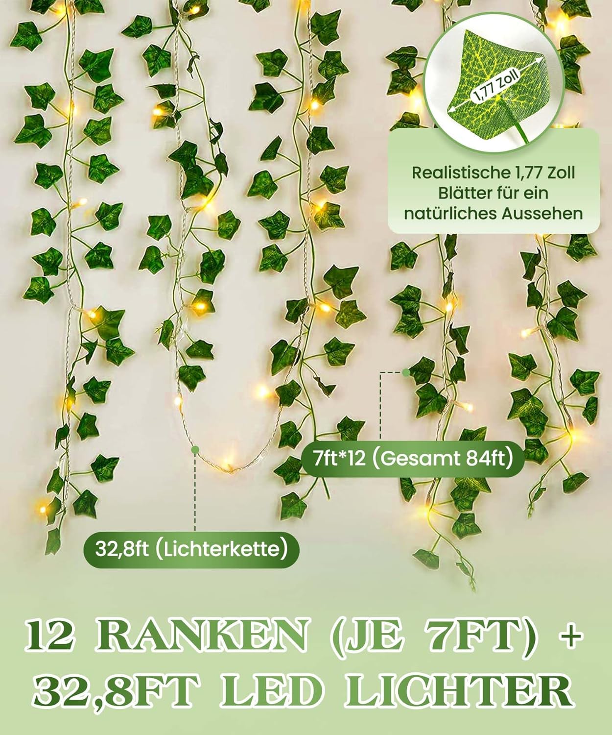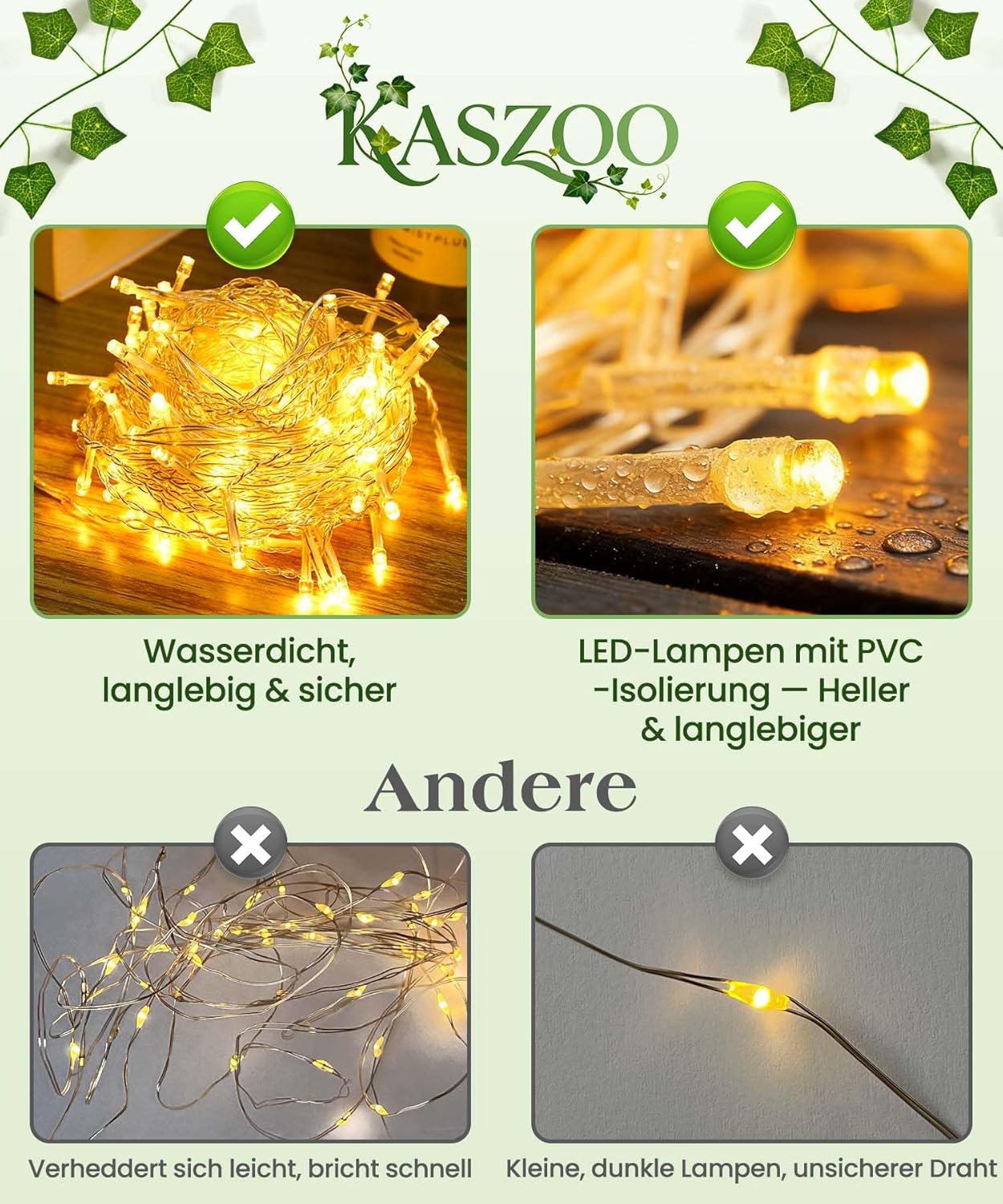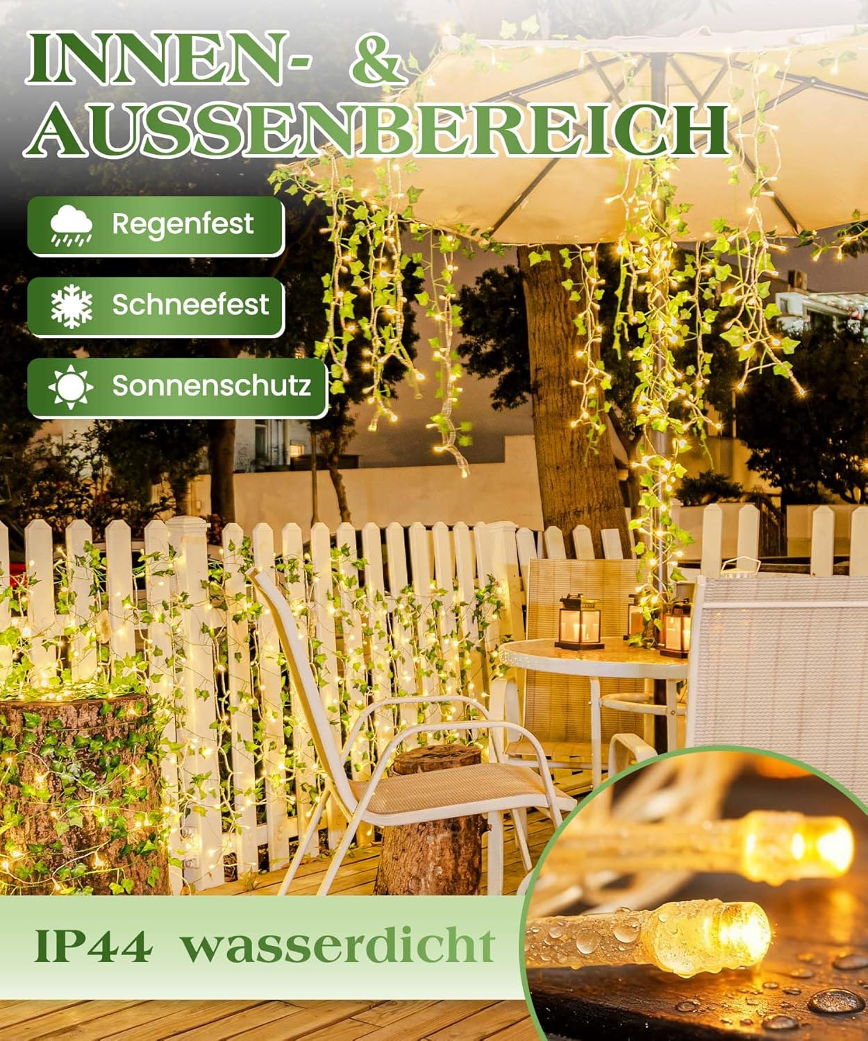 KASZOO Изкуствени листа от бръшлян за декорация на дома, сватбена декорация, градини, огради, цветни кубчета, навеси, фестивали, парти консумативи за теми като сафари джунгла, празници и др. Висококачествените феерични лампички гарантират безопасна употреба във всякакви ситуации. Могат да се използват и на открито, за декорация на партита и сватби на открито.