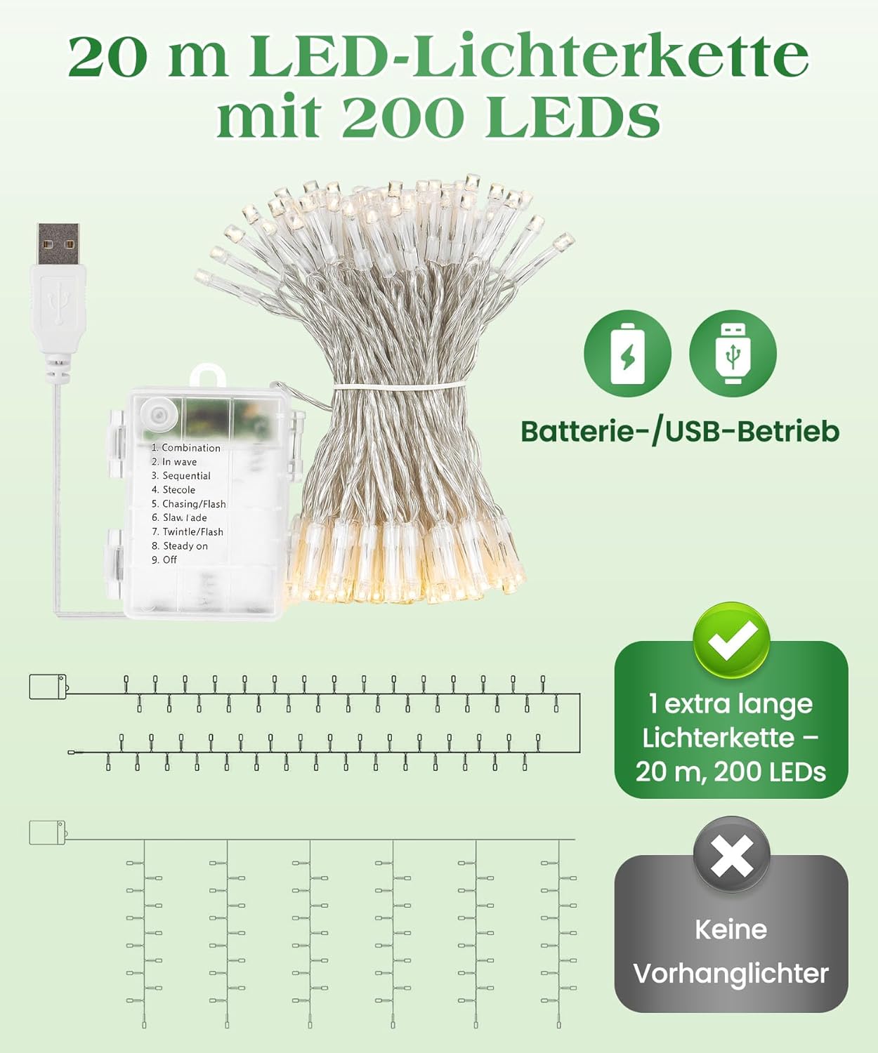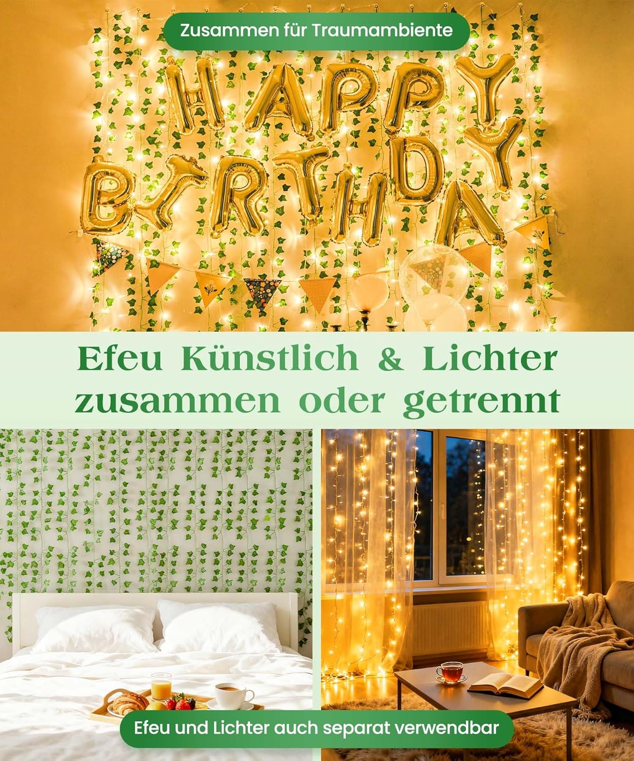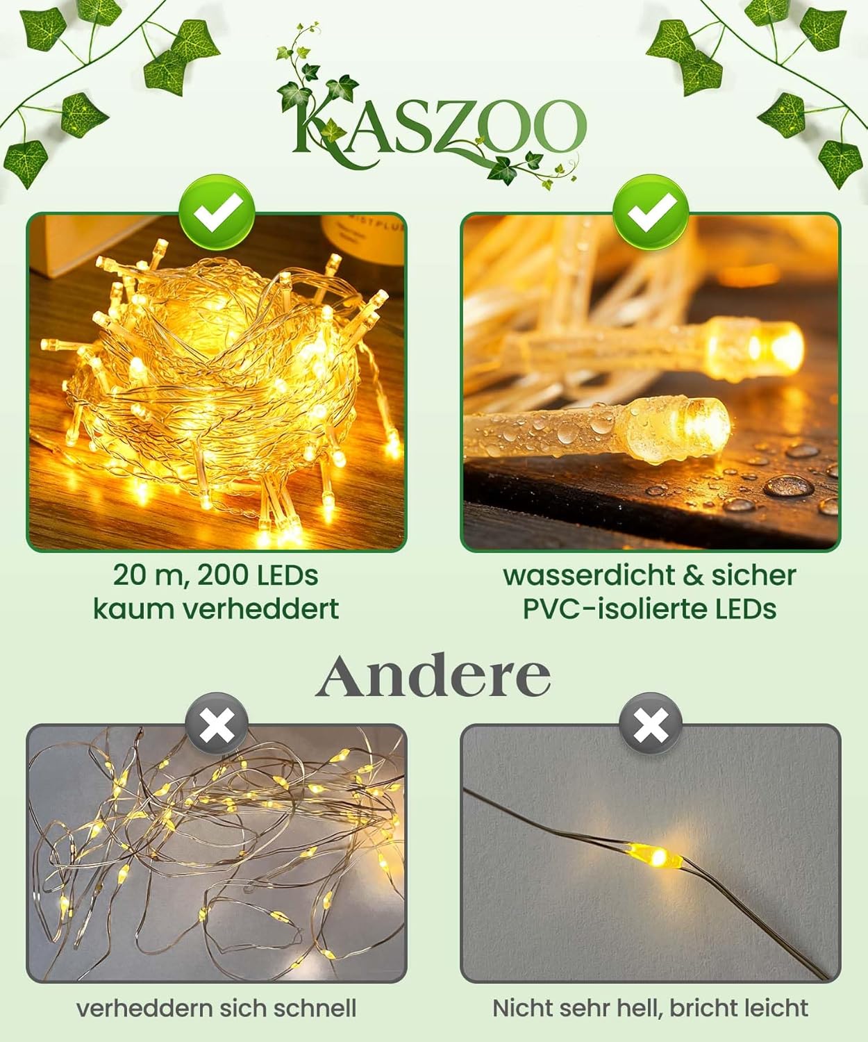 KASZOO Изкуствени листа от бръшлян за декорация на дома, сватбена декорация, градини, огради, цветни кубчета, навеси, фестивали, парти консумативи за теми като сафари джунгла, празници и др. Висококачествените феерични лампички гарантират безопасна употреба във всякакви ситуации. Могат да се използват и на открито, за декорация на партита и сватби на открито.