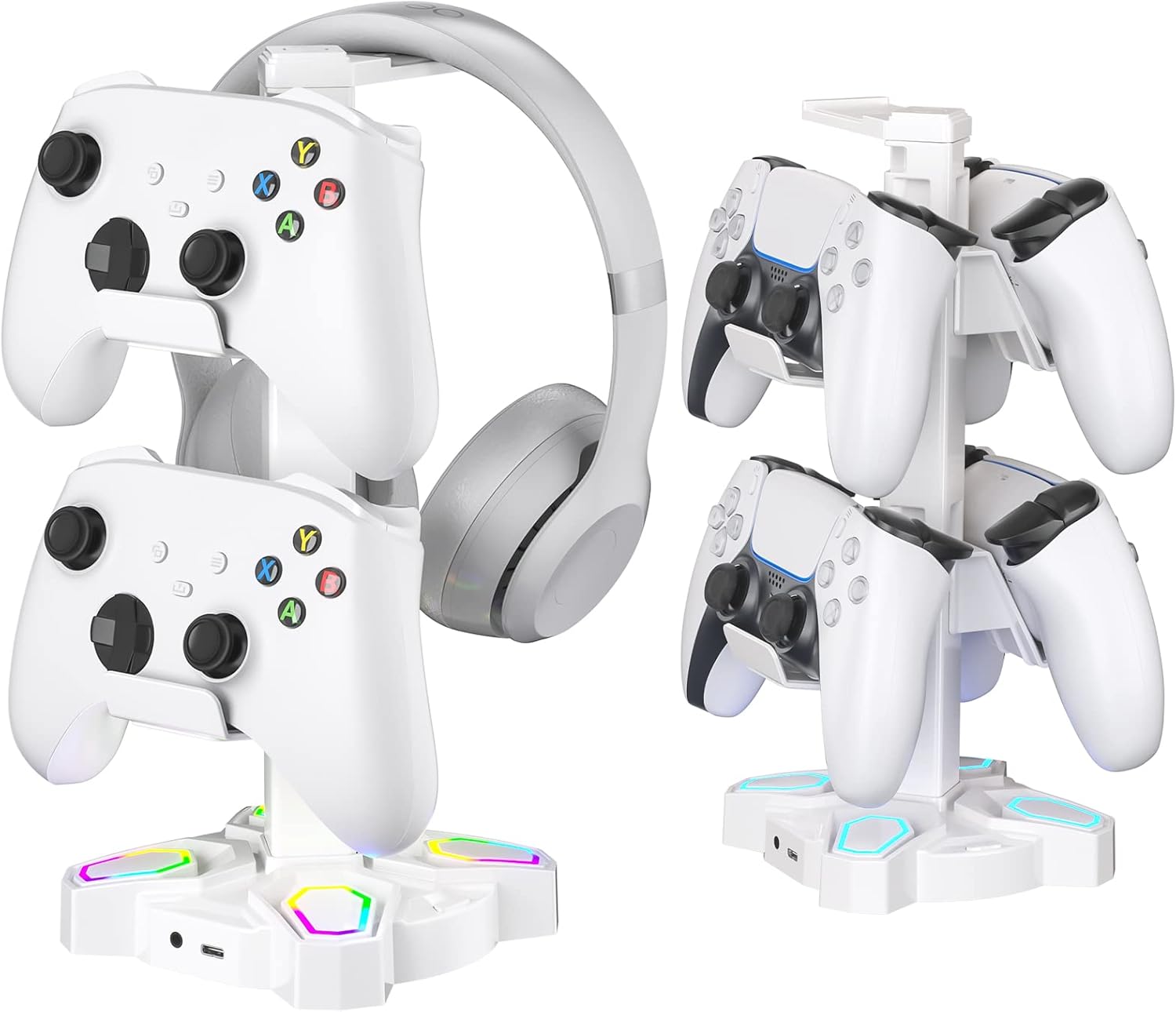 KDD държач за геймърски слушалки и държач за контролер с 9 режима на осветление, универсален държач за слушалки с USB Type-C порт, въртяща се стойка за слушалки с 3.5 мм AUX за геймъри, всички слушалки, PS4, PS5, Xbox