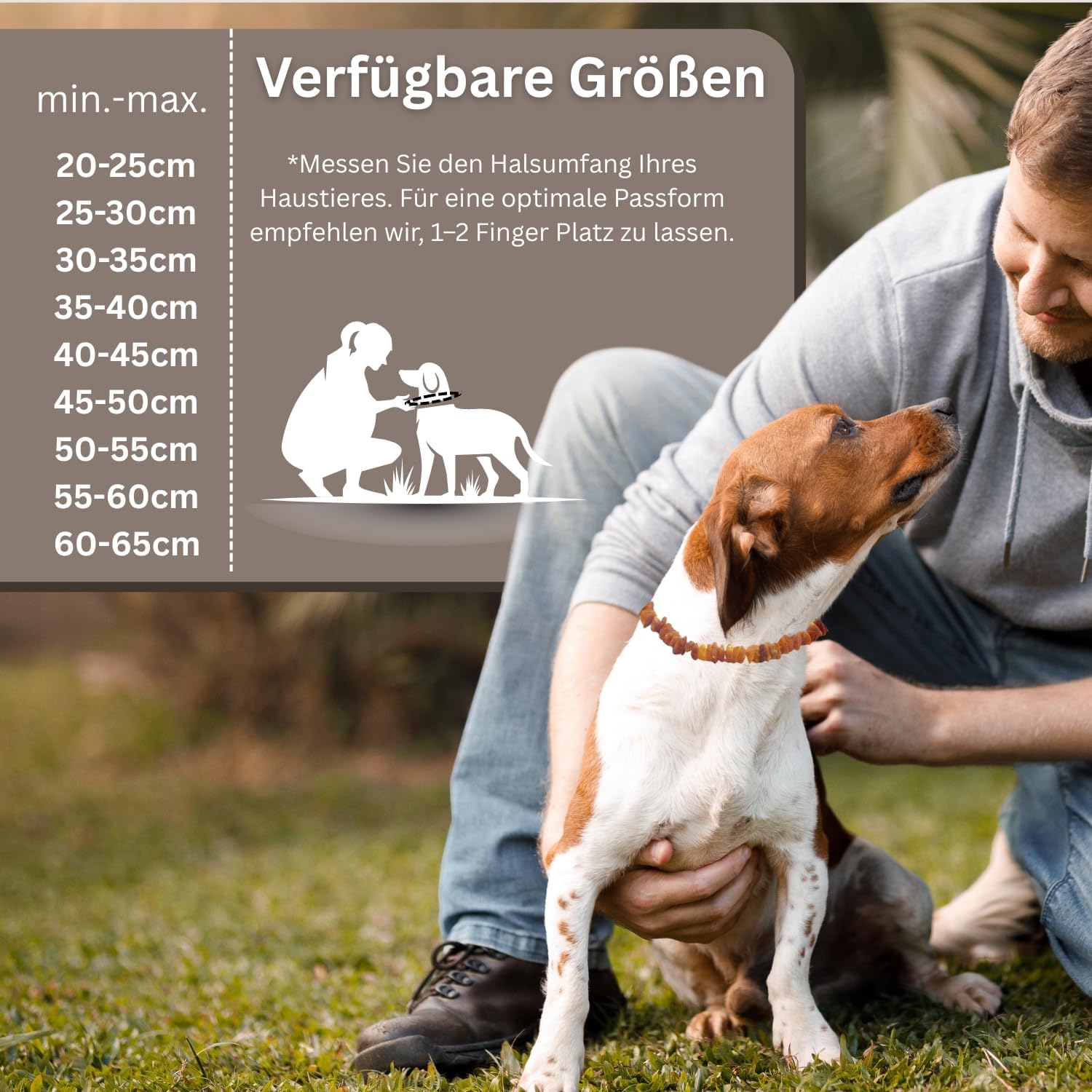 • Моля, винаги измервайте правилно! Изберете правилния размер. Нашийникът пасва перфектно, когато между врата и нашийника все още има един или два пръста. Кехлибарената верижка трябва да е плътно прилепнала, но не трябва да пречи на свободното дишане. Дали обиколката на врата е между два размера? Тогава изберете по-големия нашийник.