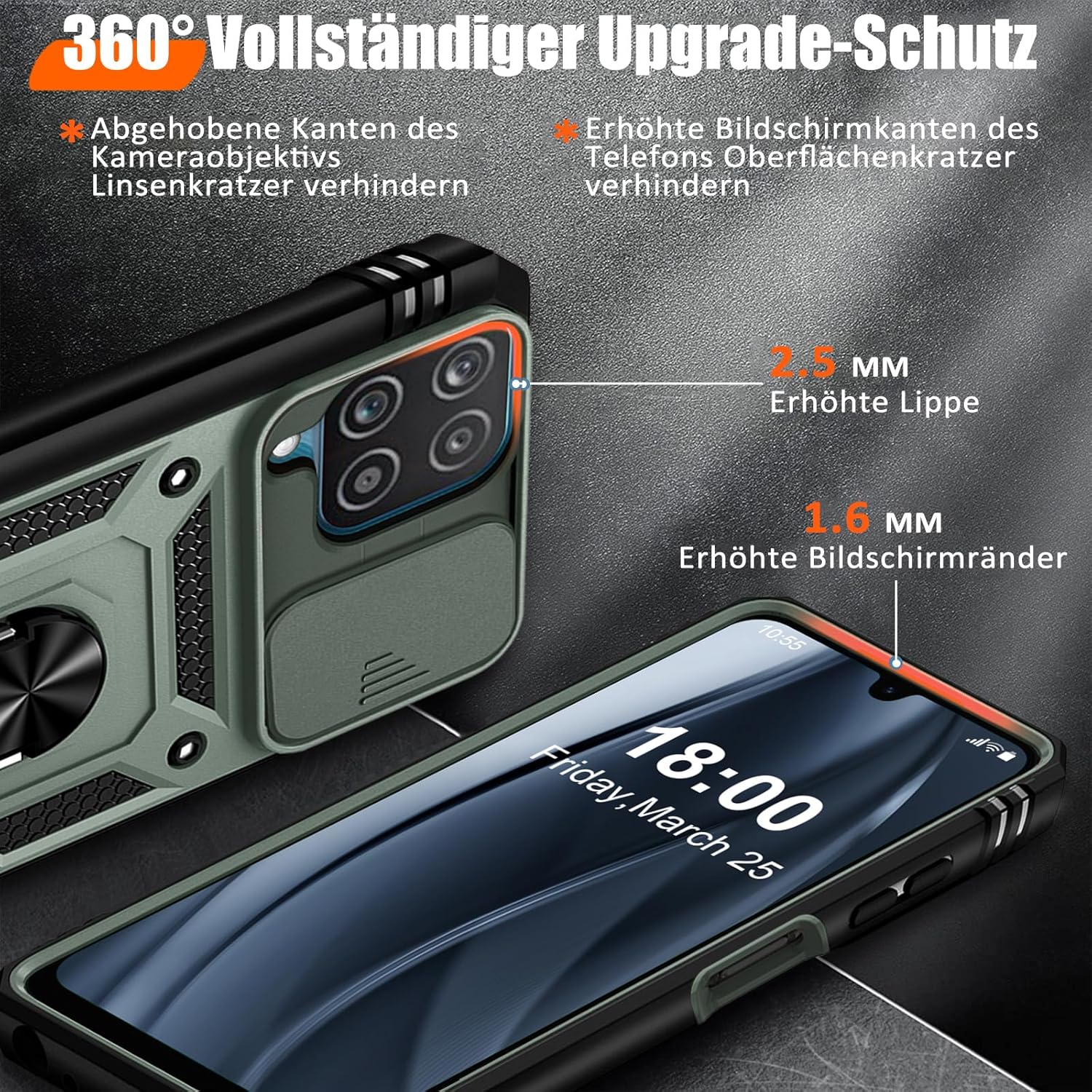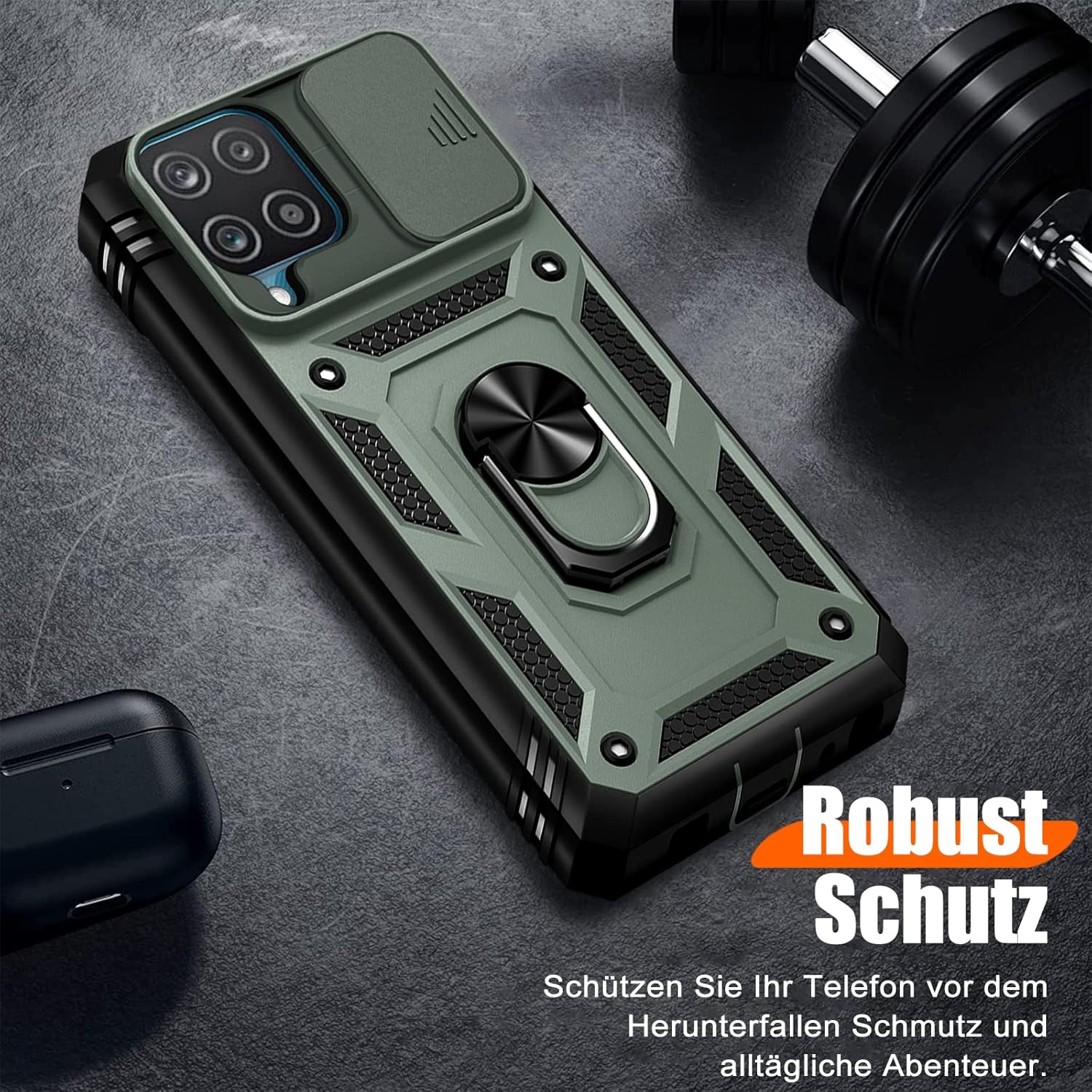 • Защита от военно ниво: калъфът за Galaxy A53 5G използва уникален TPU с ръбове в комбинация с вградени PC 2-в-1 затваряния, за да предпази телефона ви от падания, драскотини и удари. Защитата от военно ниво с технология с въздушна възглавница осигурява цялостна защита за вашето оборудване. Дизайн с плъзгач на обектива: Повдигната рамка за защита на камерата. Капачката покрива обектива и го предпазва от прах и драскотини.