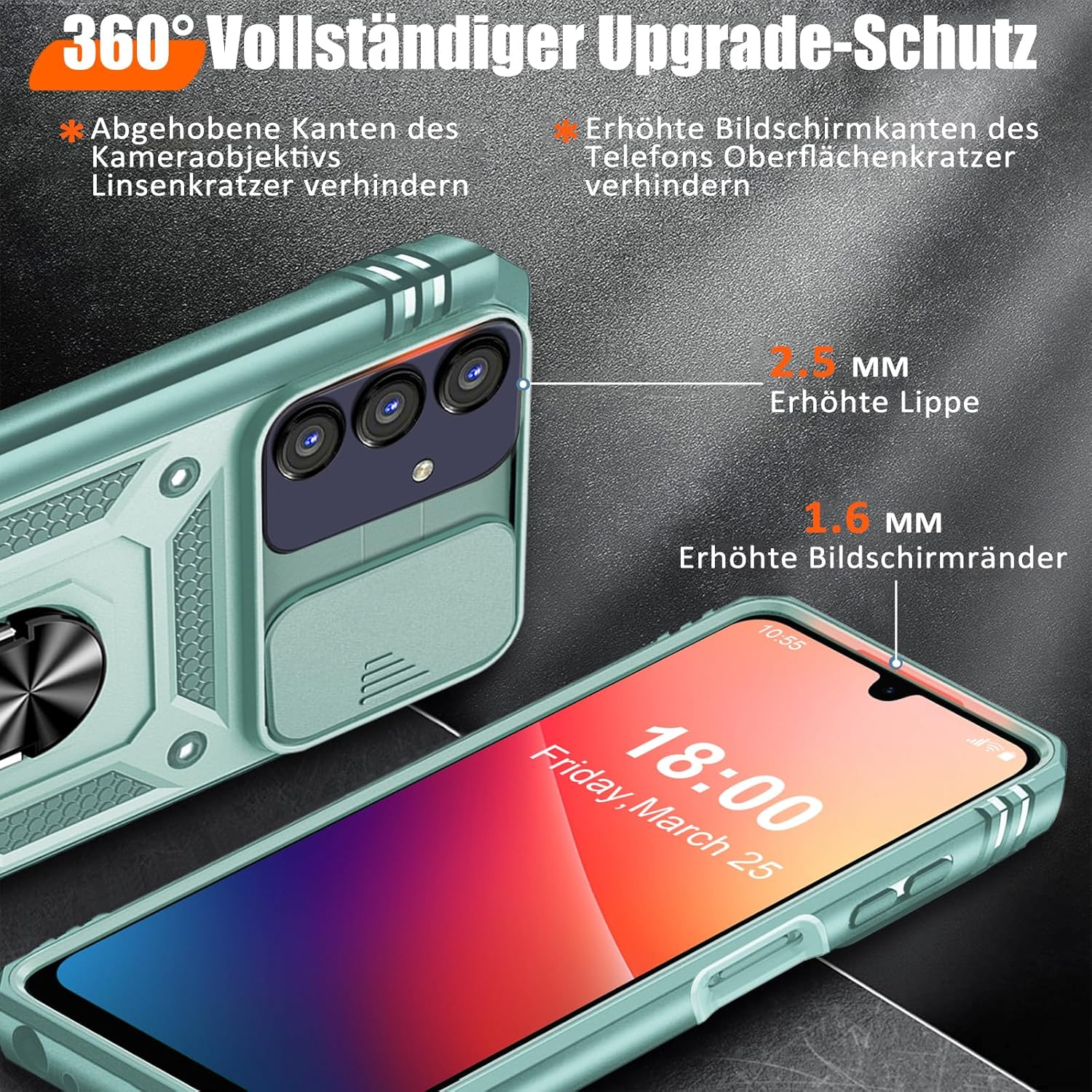 • Защита от военно ниво: калъфът за Galaxy A53 5G използва уникален TPU с ръбове в комбинация с вградени PC 2-в-1 затваряния, за да предпази телефона ви от падания, драскотини и удари. Защитата от военно ниво с технология с въздушна възглавница осигурява цялостна защита за вашето оборудване. Дизайн с плъзгач на обектива: Повдигната рамка за защита на камерата. Капачката покрива обектива и го предпазва от прах и драскотини.