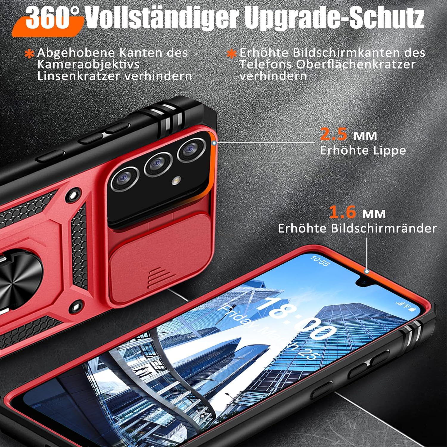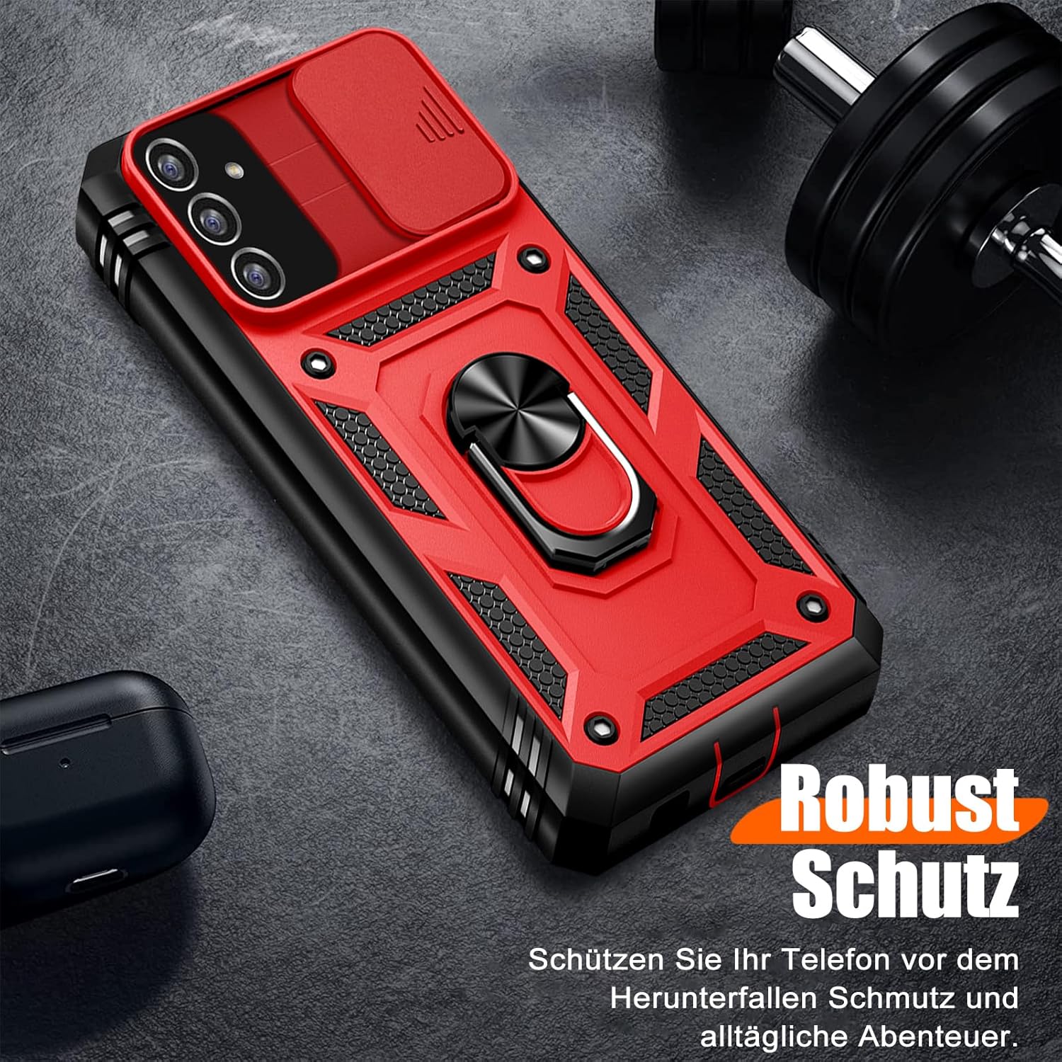 • Защита от военно ниво: калъфът за Galaxy A53 5G използва уникален TPU с ръбове в комбинация с вградени PC 2-в-1 затваряния, за да предпази телефона ви от падания, драскотини и удари. Защитата от военно ниво с технология с въздушна възглавница осигурява цялостна защита за вашето оборудване. Дизайн с плъзгач на обектива: Повдигната рамка за защита на камерата. Капачката покрива обектива и го предпазва от прах и драскотини.
