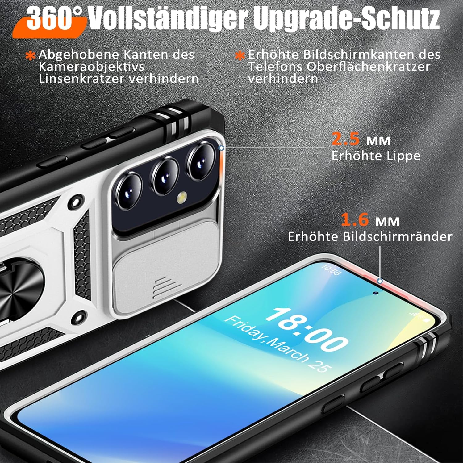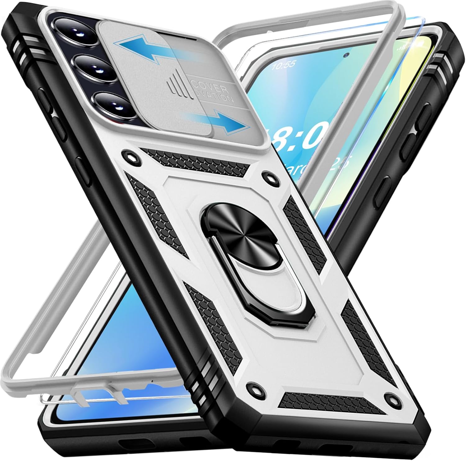 Кейс Giyer за Samsung Galaxy A55 5G с протектор за екрана, Кейс за мобилен телефон A55 5G със защита на камерата, 360° метален пръстен, стойка, удароустойчив, защитен калъф за Samsung A55 (бял)